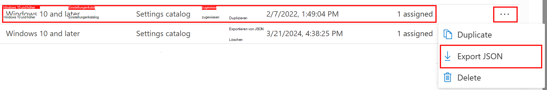 Um eine vorhandene Richtlinie zu exportieren, wählen Sie die Windows-Einstellungskatalogrichtlinie und dann die Auslassungspunkte/das Kontextmenü (