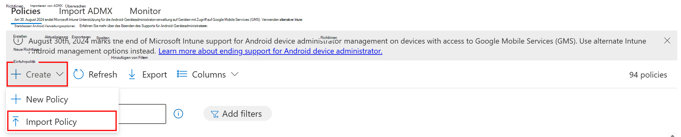 Wählen Sie Geräte>Geräte verwalten>Konfiguration>Erstellen>Neue Richtlinie aus.