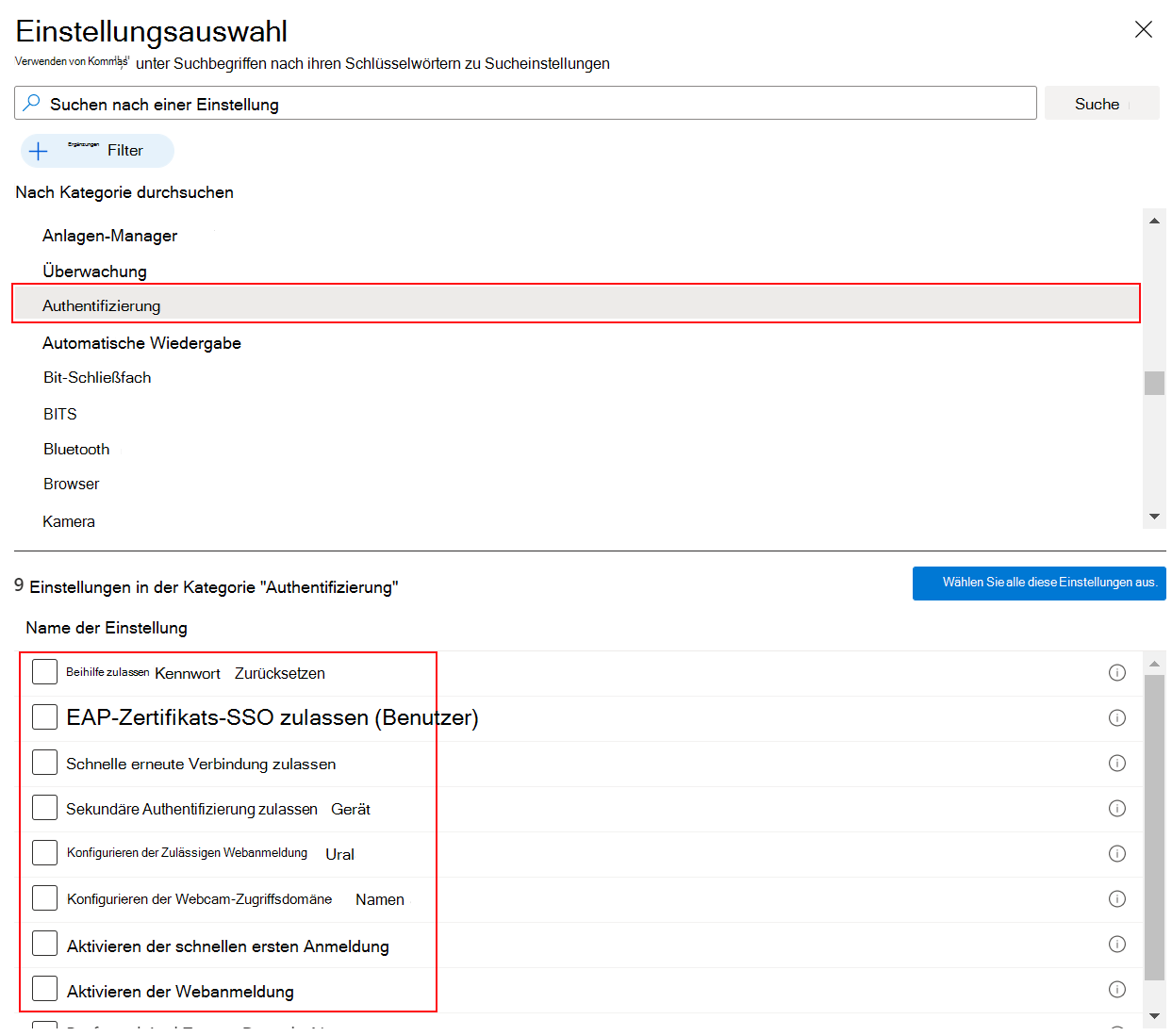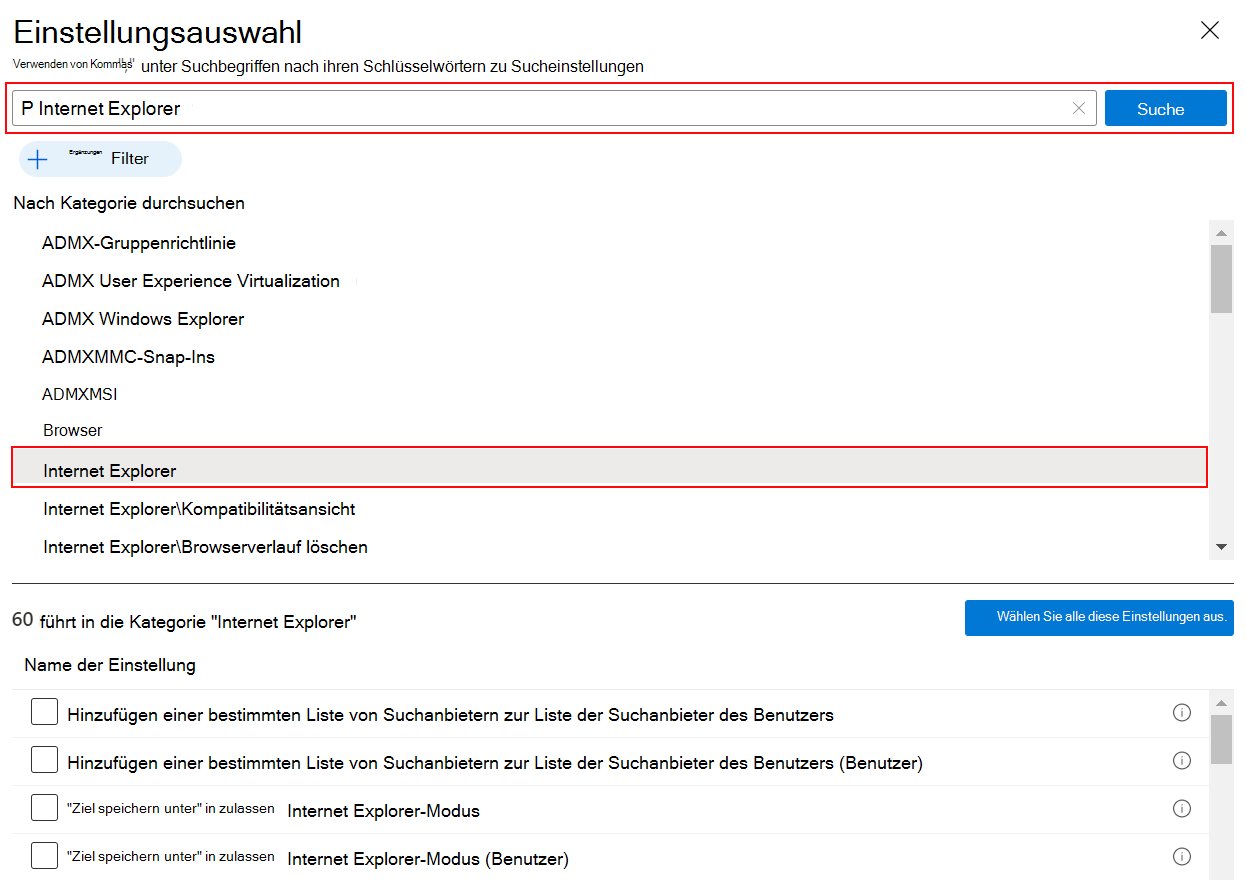 Im Einstellungskatalog sind Tausende von Einstellungen verfügbar. Verwenden Sie die Such- und Filterfunktionen, um die gewünschten Einstellungen zu finden.