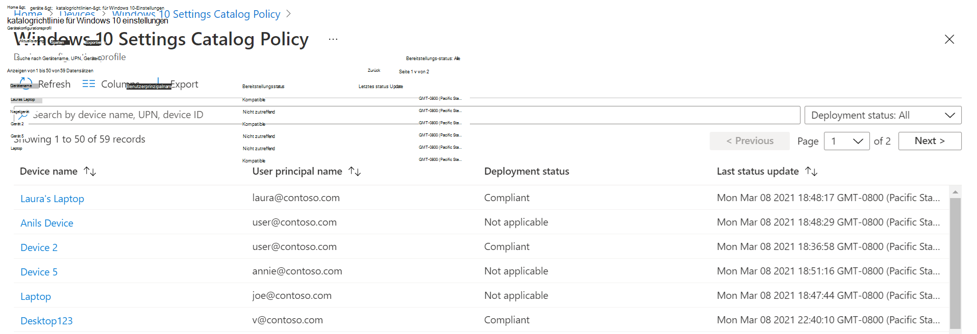 Wählen Sie Bericht anzeigen aus. Der Bericht zeigt detaillierte Informationen, einschließlich des Gerätenamens, des Richtlinienstatus und mehr. Sie können auch nach dem Bereitstellungs-status filtern und den Bericht in eine