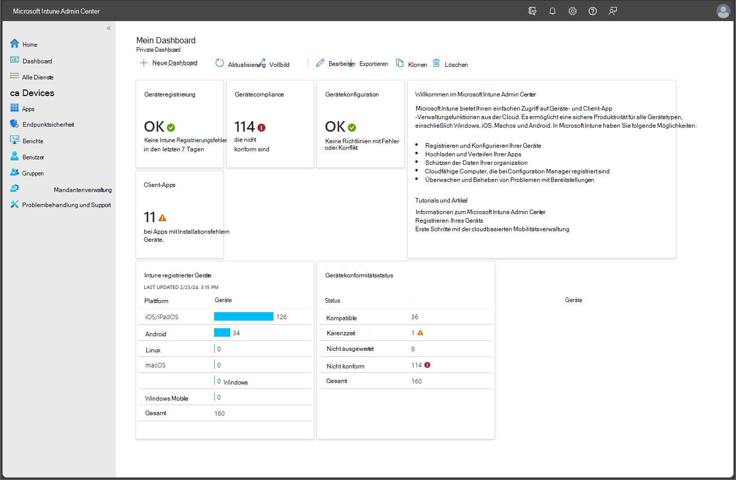 Das Dashboard zeigt allgemeine Details zu den Geräten und Client-Apps in Ihrem Intune-Mandanten an. Dashboards bieten Ihnen die Möglichkeit, eine fokussierte und organisierte Ansicht im Microsoft Intune Admin Center zu erstellen. Verwenden Sie Dashboards als Arbeitsbereich, in dem Sie schnell Aufgaben für tägliche Vorgänge starten und Ressourcen überwachen können. Erstellen Sie beispielsweise benutzerdefinierte Dashboards basierend auf Projekten, Aufgaben oder Benutzerrollen. Das Microsoft Intune Admin Center bietet eine Standard-Dashboard als Ausgangspunkt. Sie können das Standarddashboard bearbeiten, zusätzliche Dashboards erstellen und anpassen sowie Dashboards veröffentlichen und freigeben, um sie anderen Benutzern zur Verfügung zu stellen.