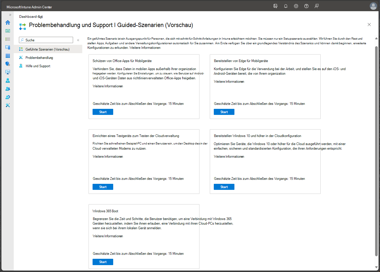 Wählen Sie im Navigationsbereich Problembehandlung + Support>Geführte Szenarios aus, um verfügbare geführte Szenarios in Intune anzuzeigen.