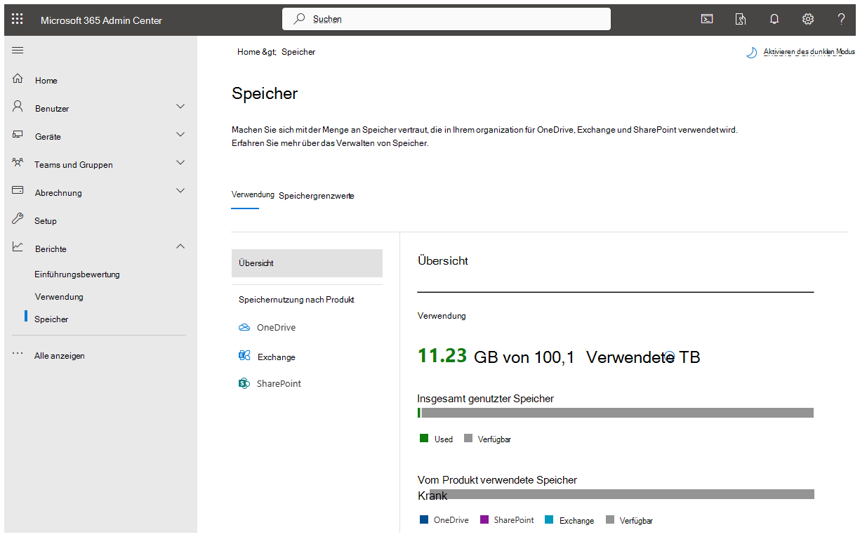 Kunden, die der Poolspeicherrichtlinie unterliegen, haben Zugriff auf den Speicherbericht im Microsoft 365 Admin Center unter Berichtsspeicher>. Der Benutzer muss als SharePoint-Administrator oder globaler Administrator angemeldet sein, um auf den Speicherbericht zugreifen zu können.