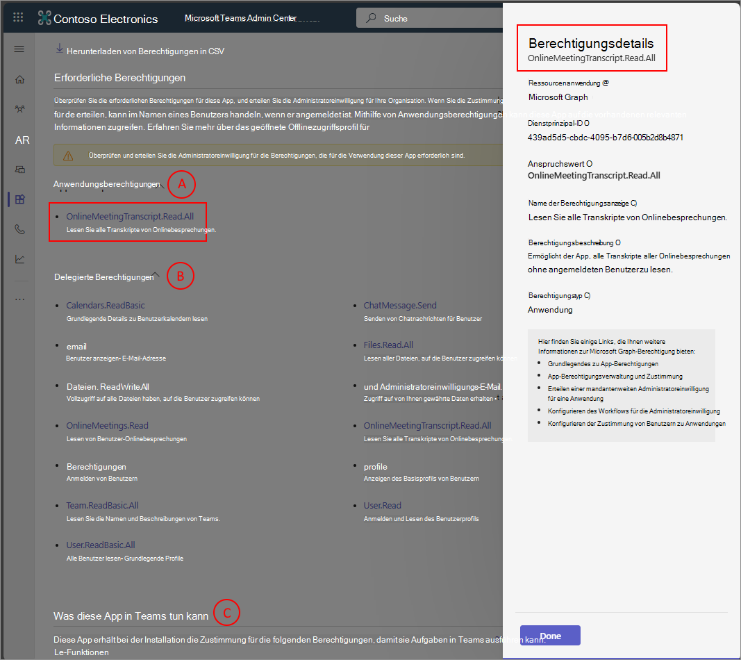 Für jede App sind die zugehörigen Berechtigungen auf der Seite mit den App-Details im Admin Center aufgeführt.