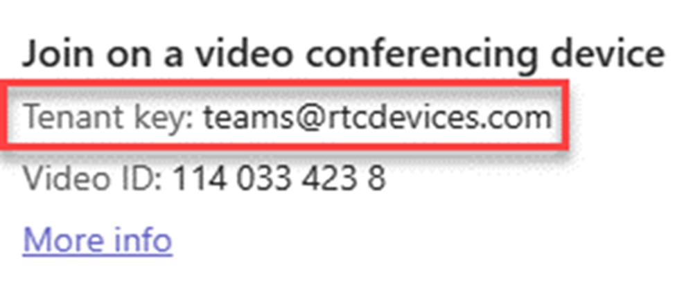 - Sie können sich direkt in die Teams-Besprechung einwählen, ohne mit der IVR des Partners zu interagieren, indem Sie die Direktwahlfunktion verwenden, indem Sie die vollständige Zeichenfolge von tenantkey verwenden. VTC-ConferenceId@___domain.