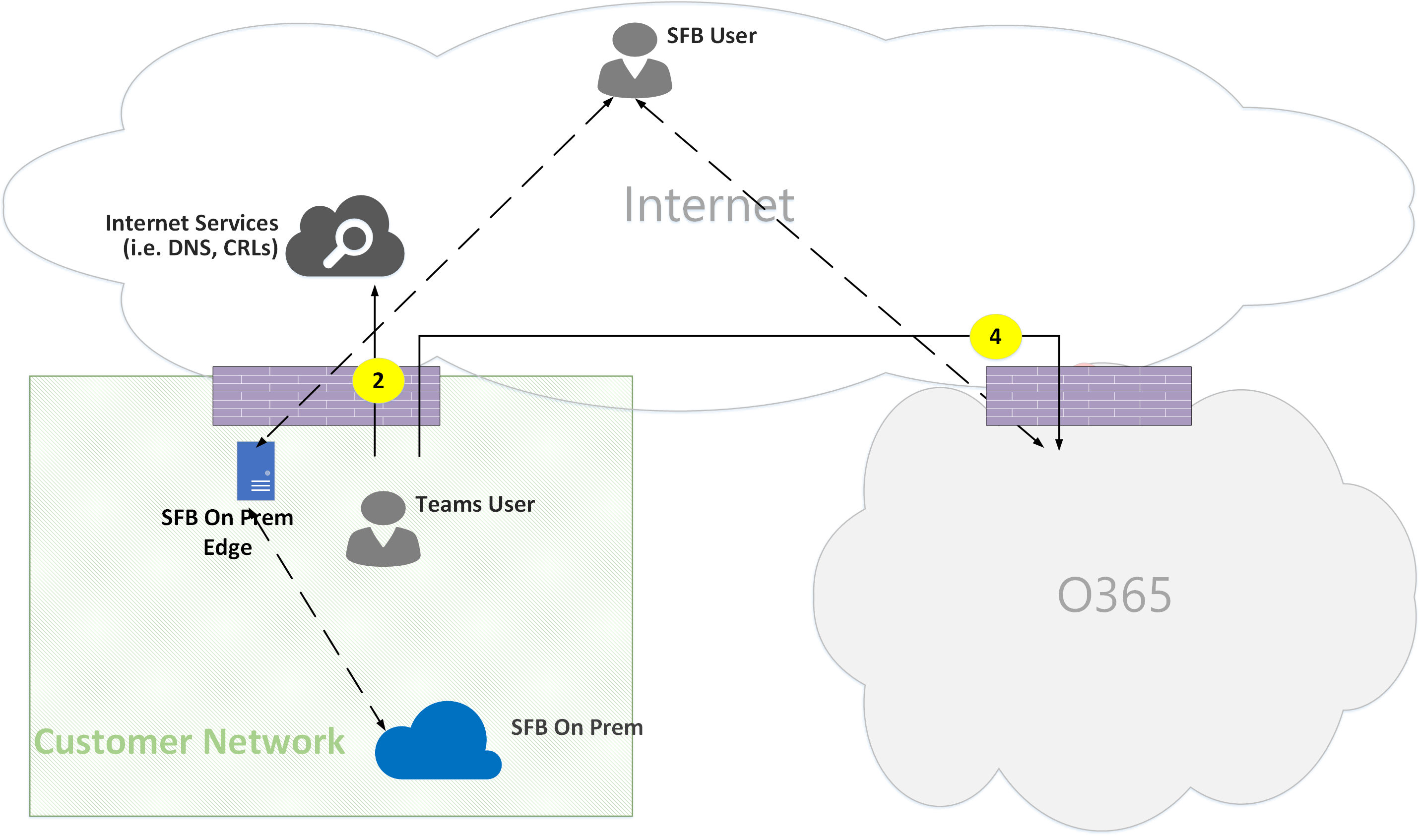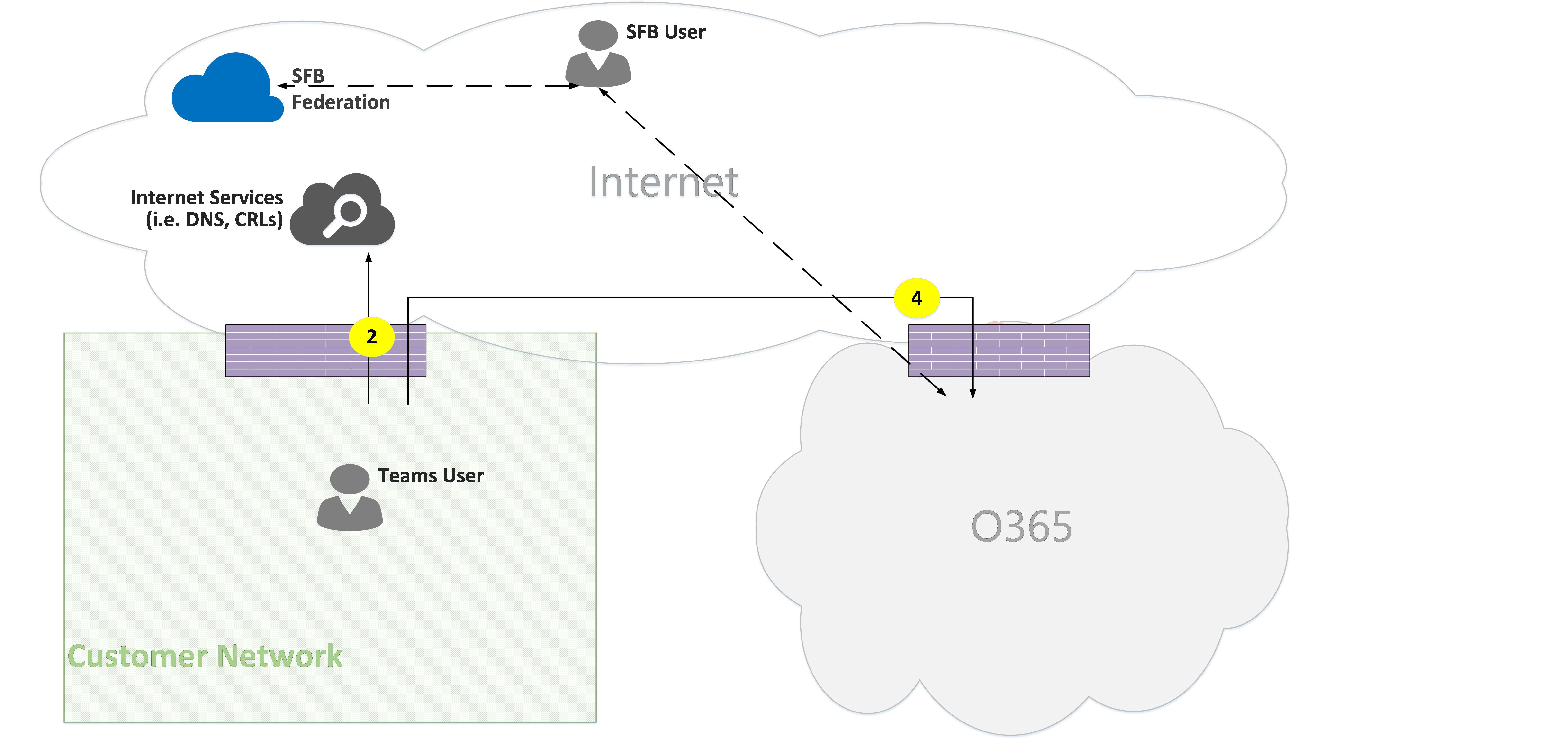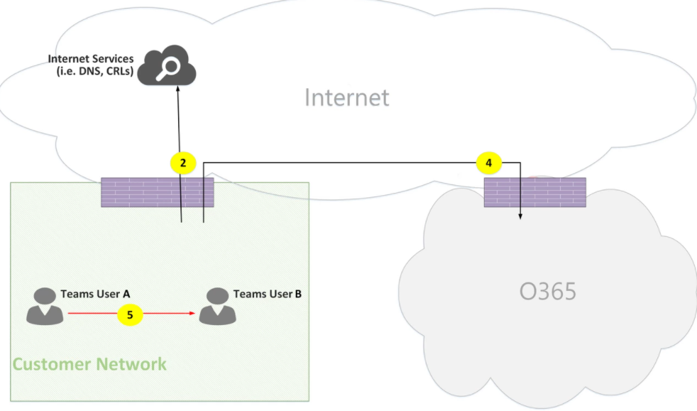 - Flow 4 : Stellt einen von einem Benutzer im Kundennetzwerk initiierten Flow zu Microsoft 365 Teams-Endpunkten dar.