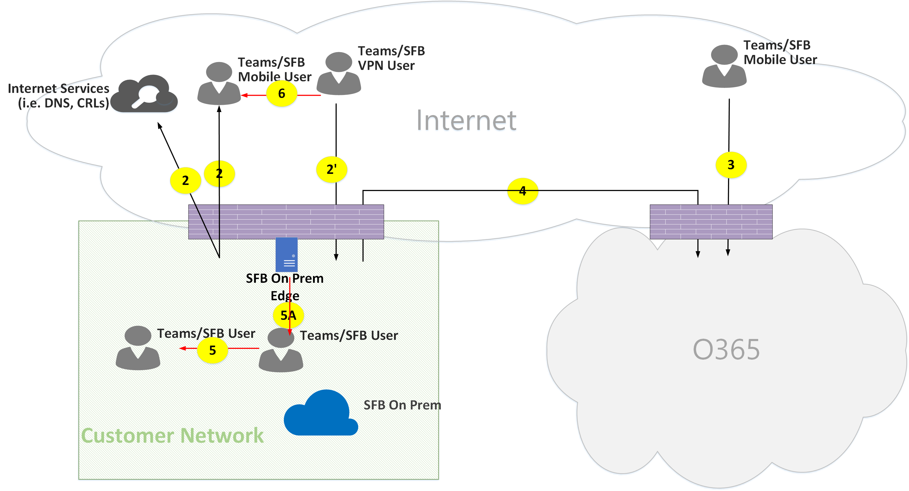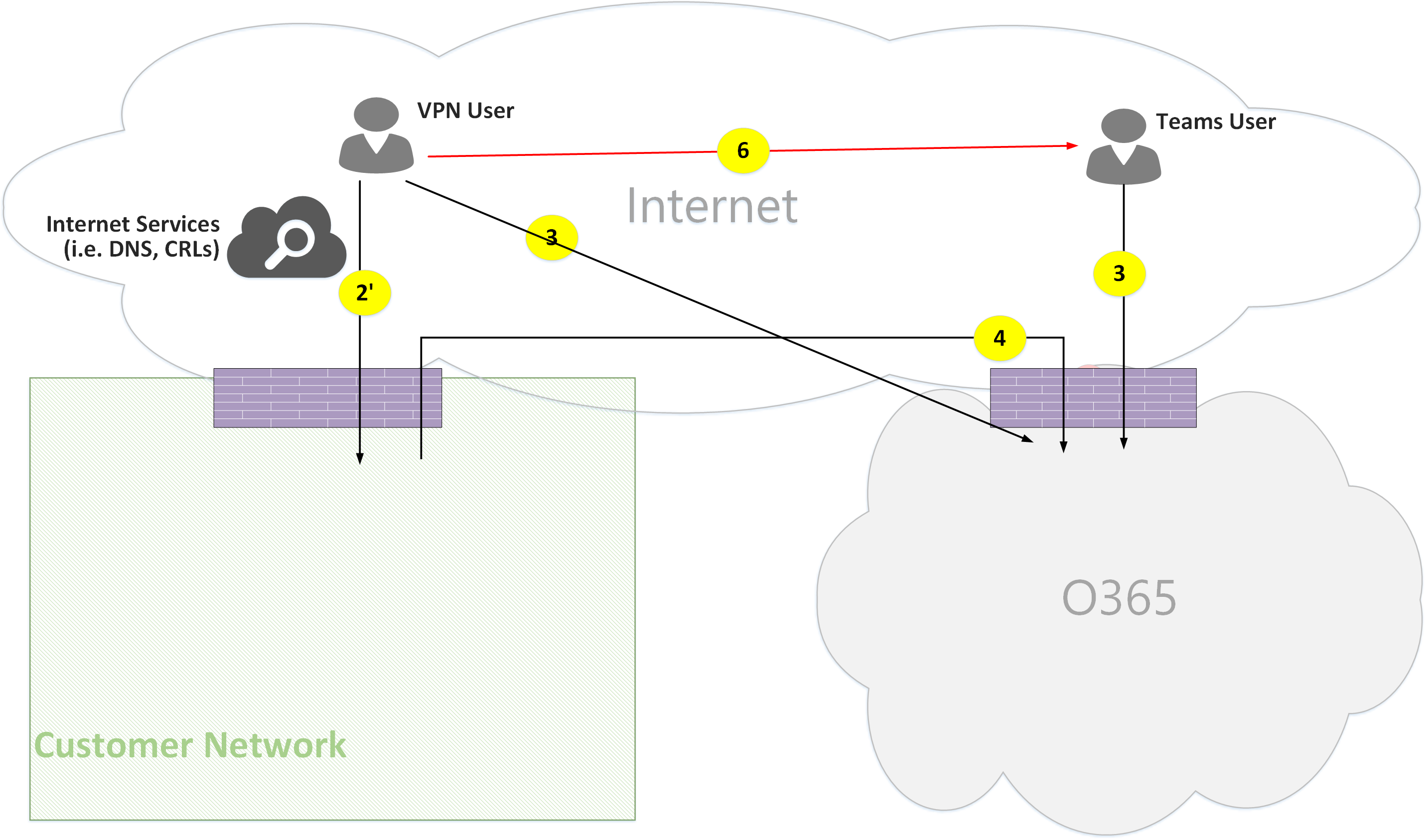 - Flow 2' – Stellt einen Flow dar, der von einem mobilen Teams-Remotebenutzer mit VPN zum Kundennetzwerk initiiert wurde.