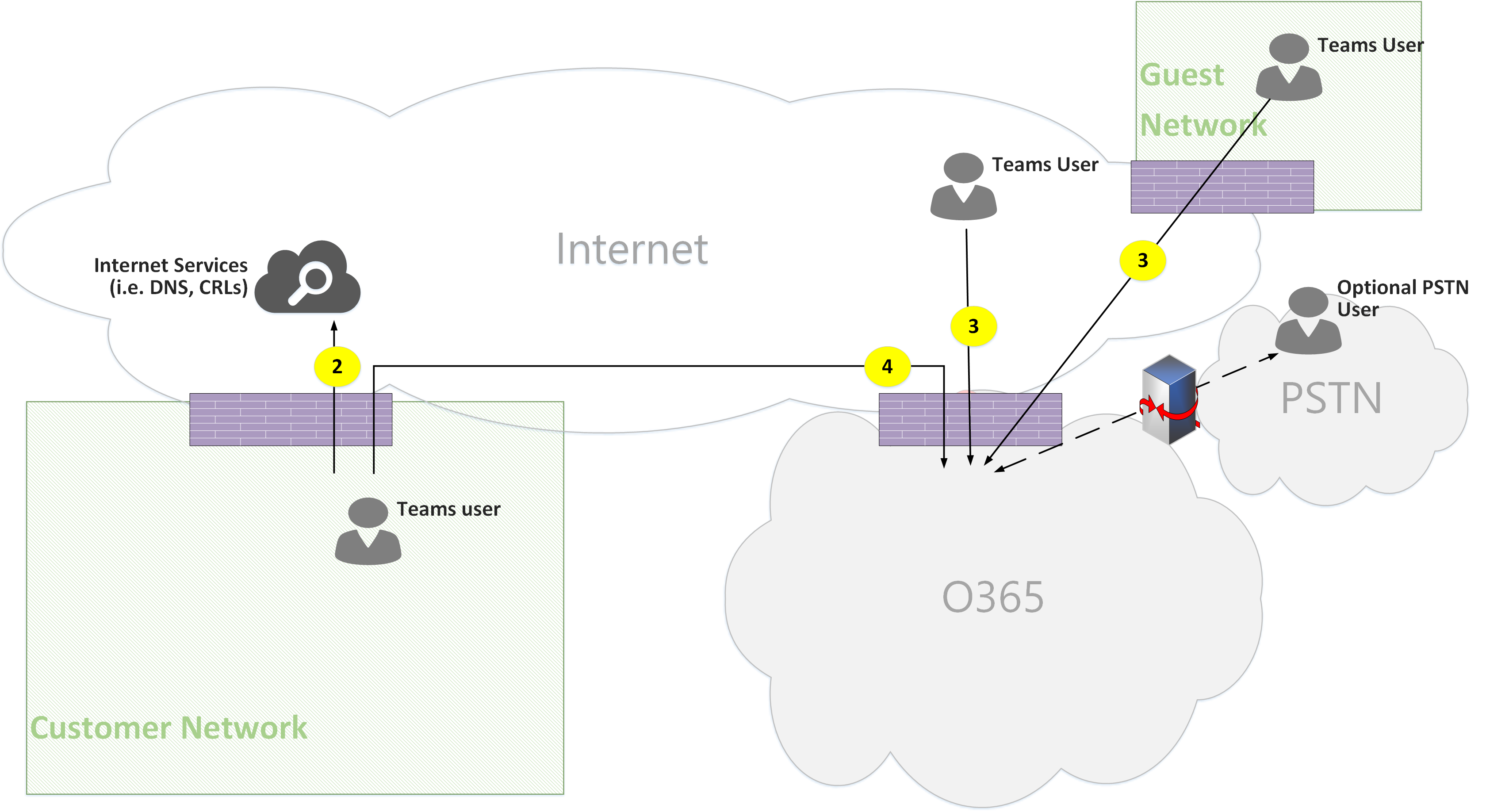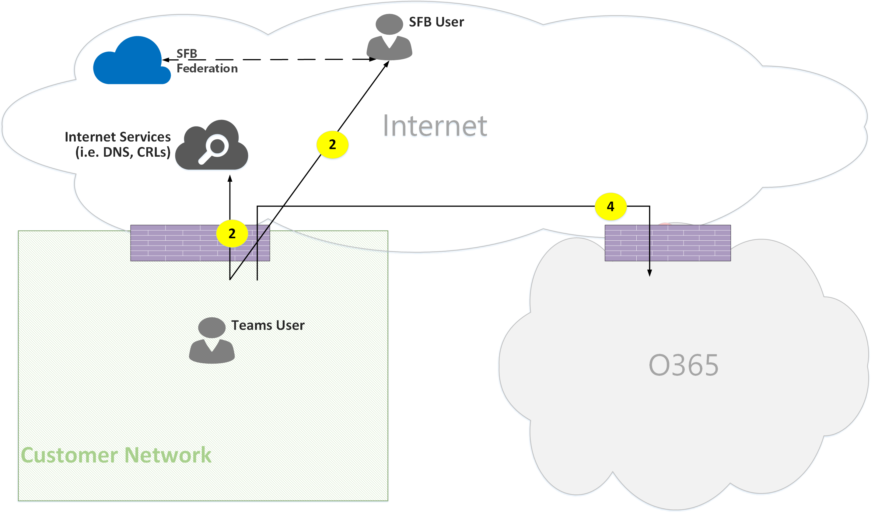 - Flow 2 – Stellt einen Von einem Benutzer im Kundennetzwerk initiierten Flow zum Internet als Teil der Teams-Erfahrung des Benutzers dar. Beispiele für diese Flows sind DNS- und Peer-to-Peer-Medien.