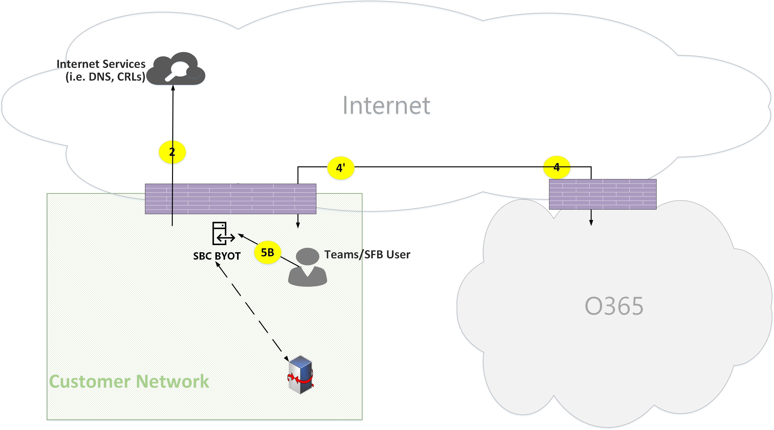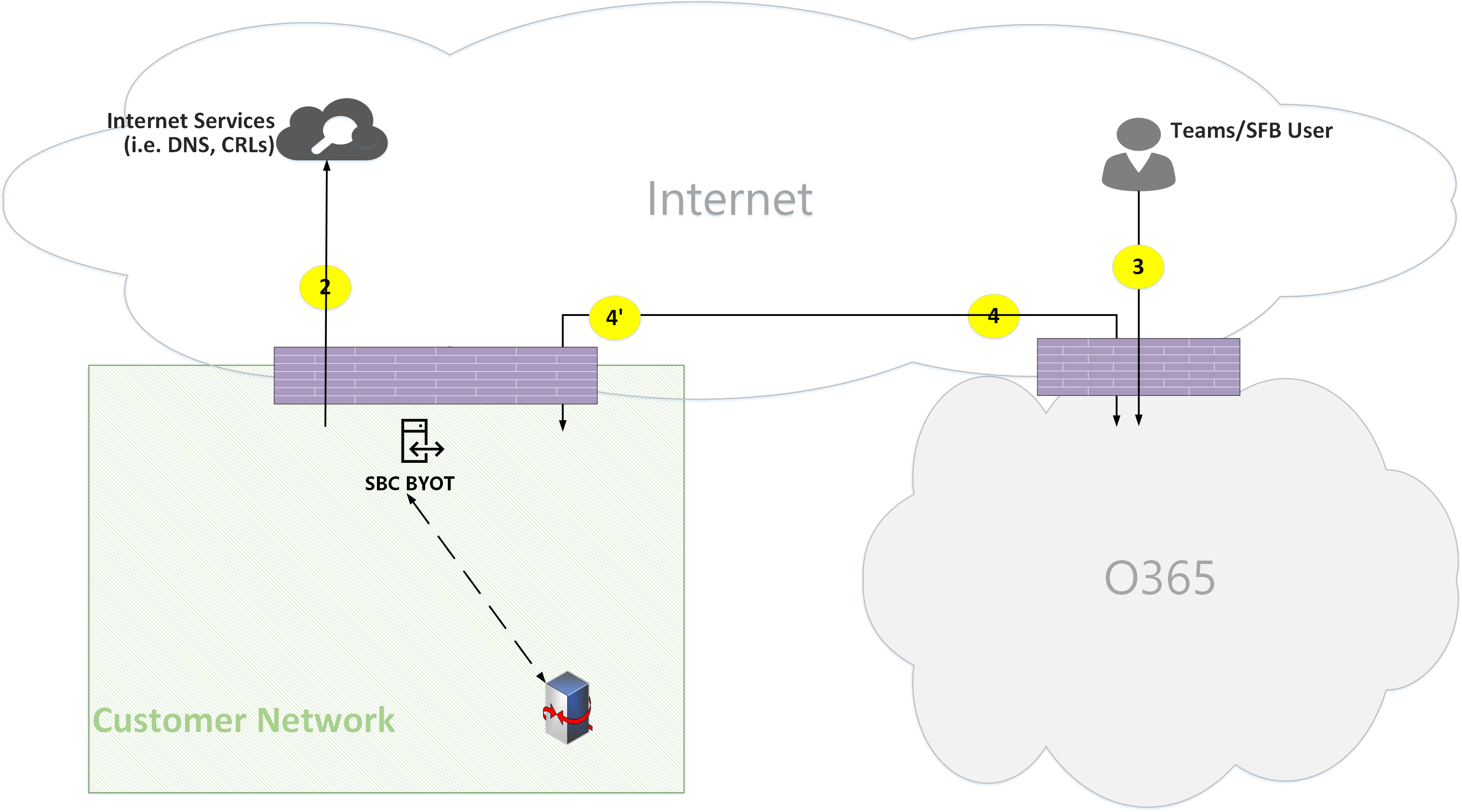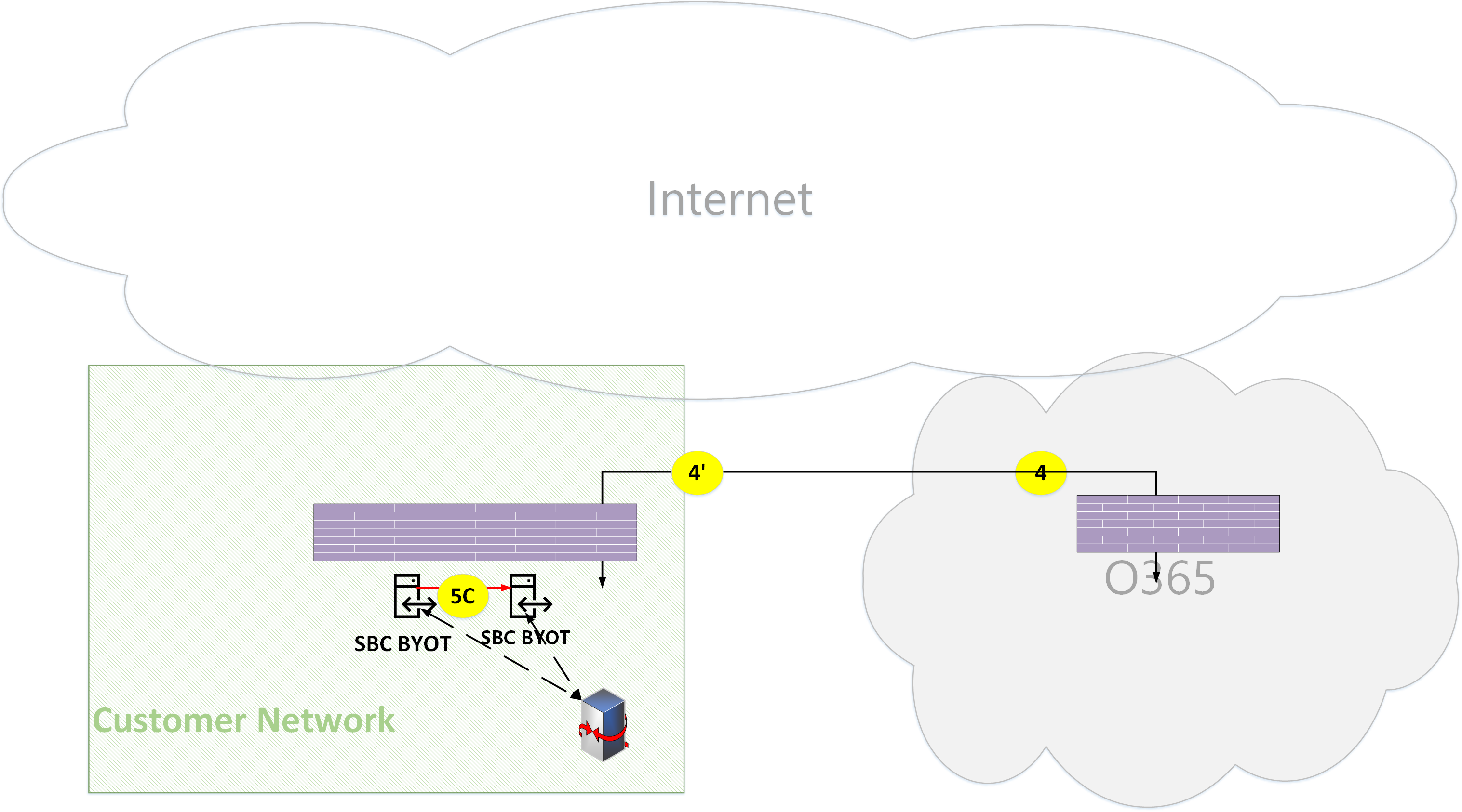 - Flow 4' – Stellt einen Flow von Microsoft 365 zum Kundennetzwerk dar, der verwendet wird, um eine Verbindung zwischen dem Teams-Medienserver in der Cloud und dem lokalen SBC herzustellen.