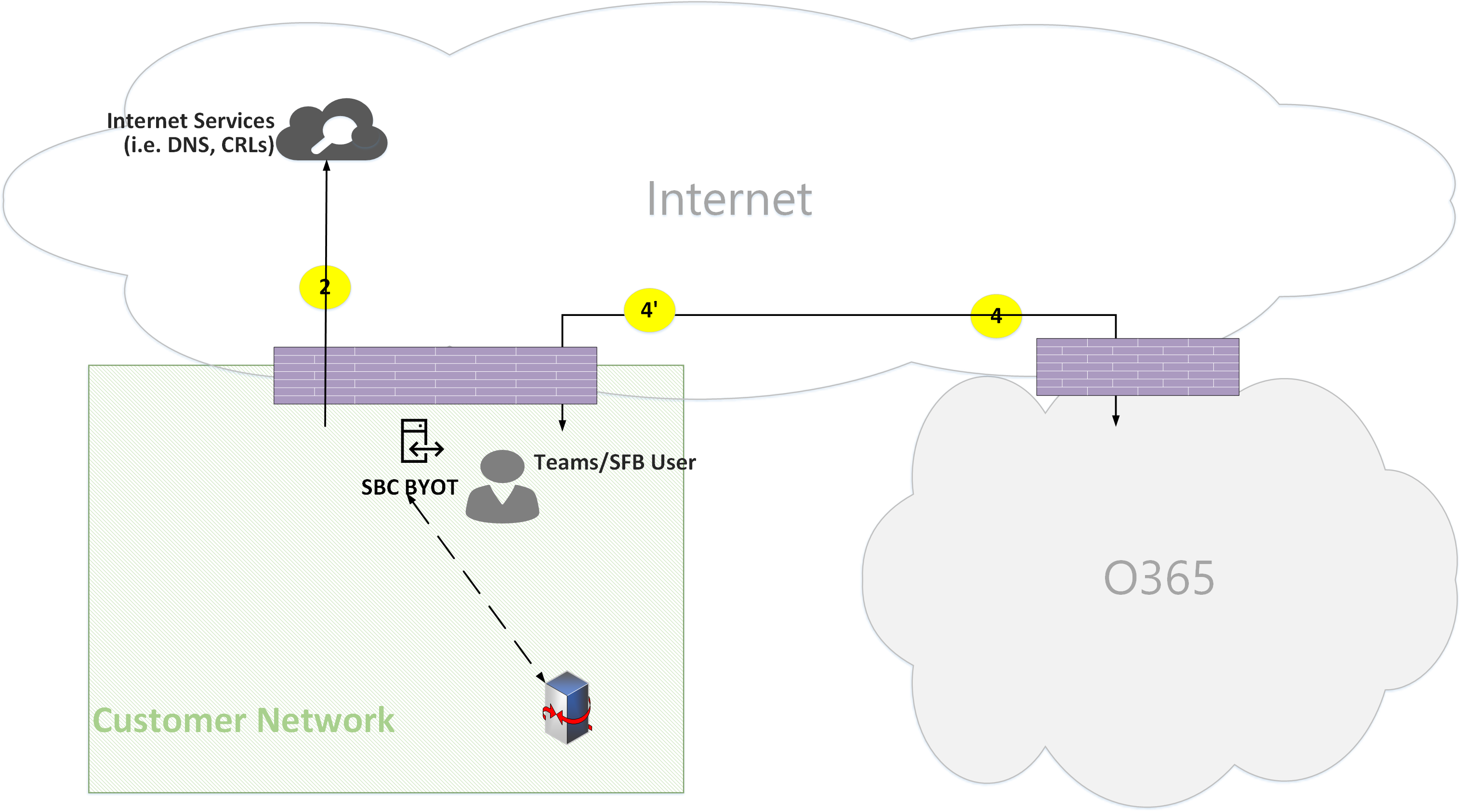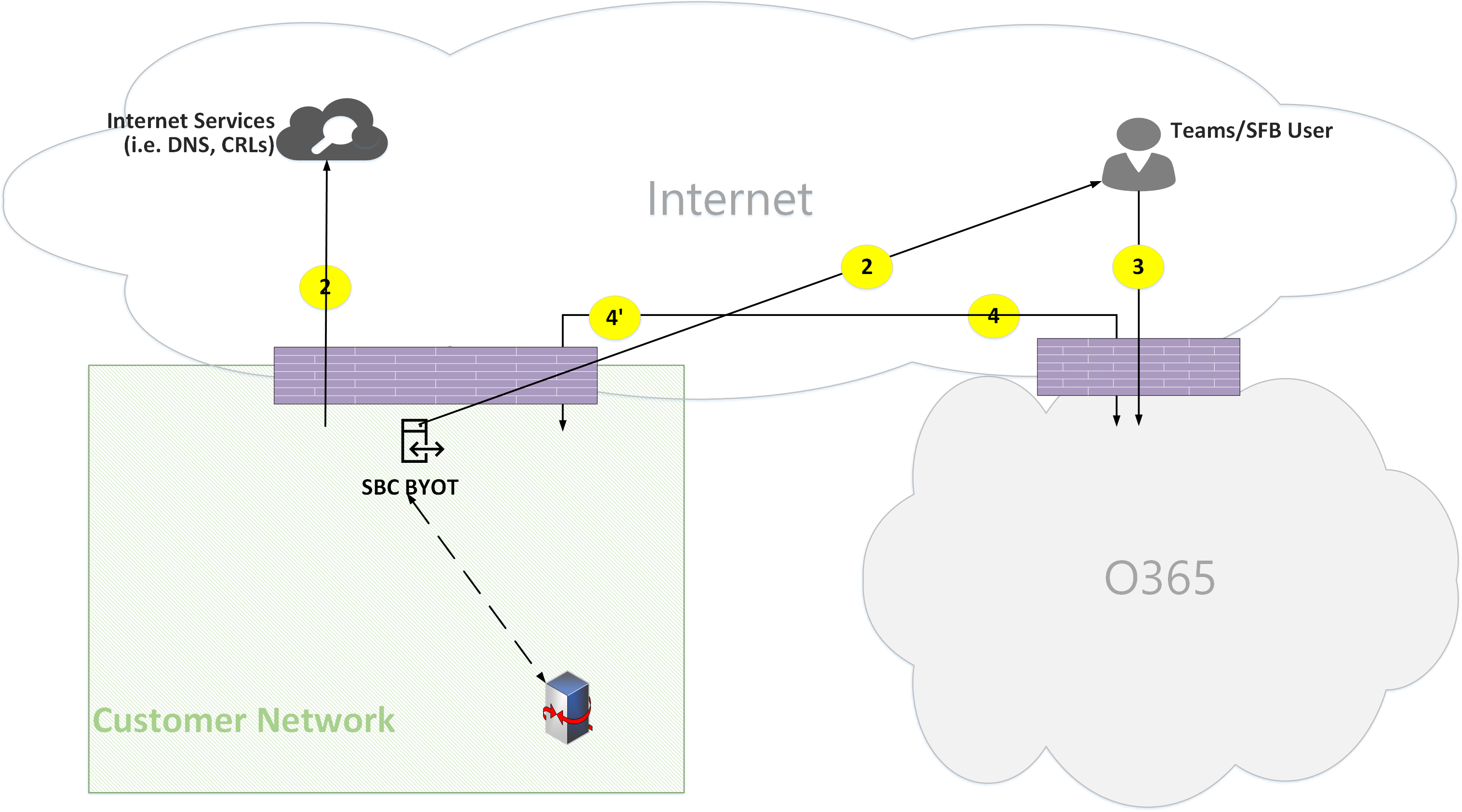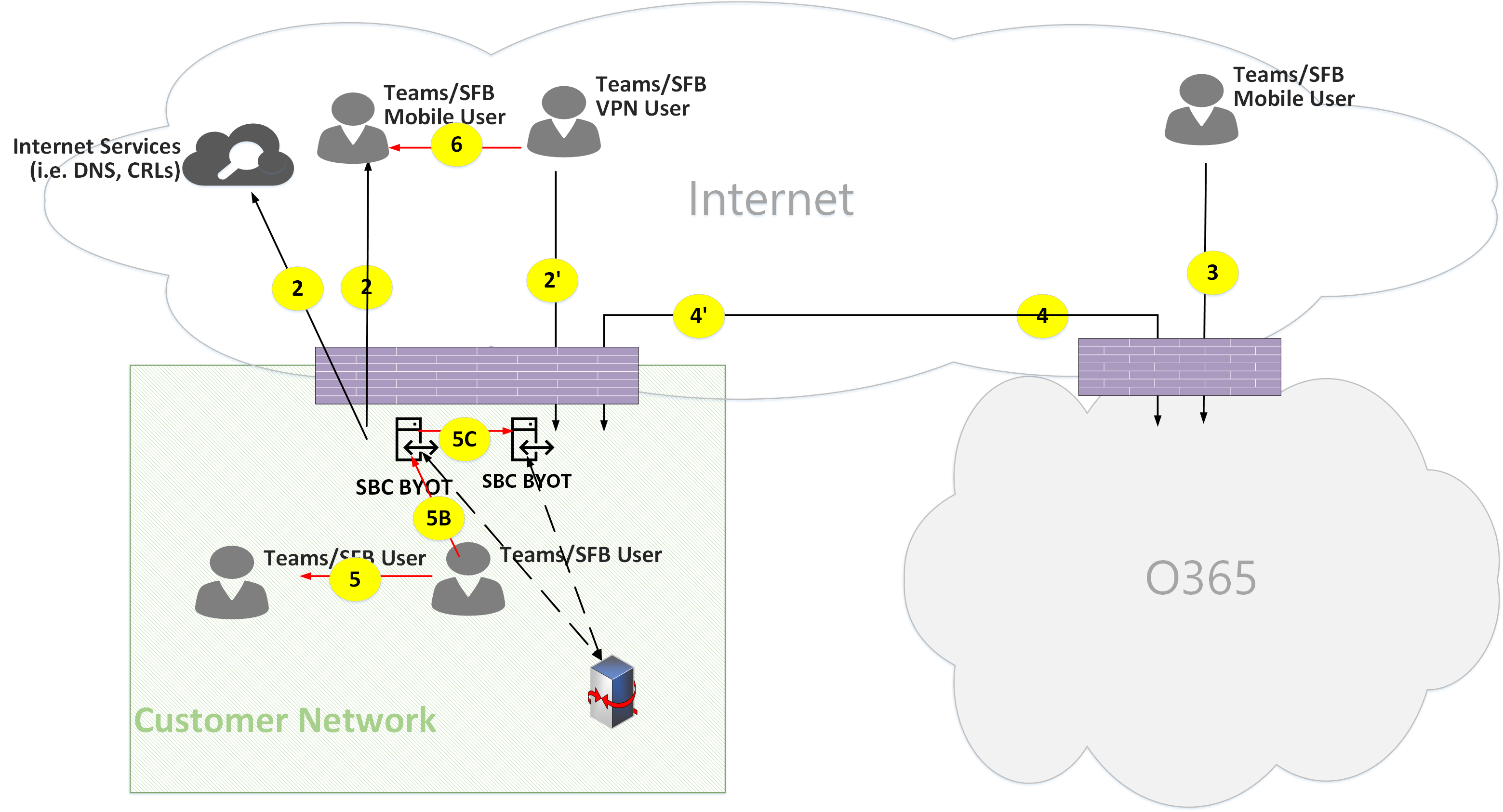 - Flow 4' – Stellt einen Flow von Microsoft 365 zum Kundennetzwerk dar, der verwendet wird, um eine Verbindung zwischen dem Teams-Medienserver in der Cloud und dem lokalen SBC herzustellen.