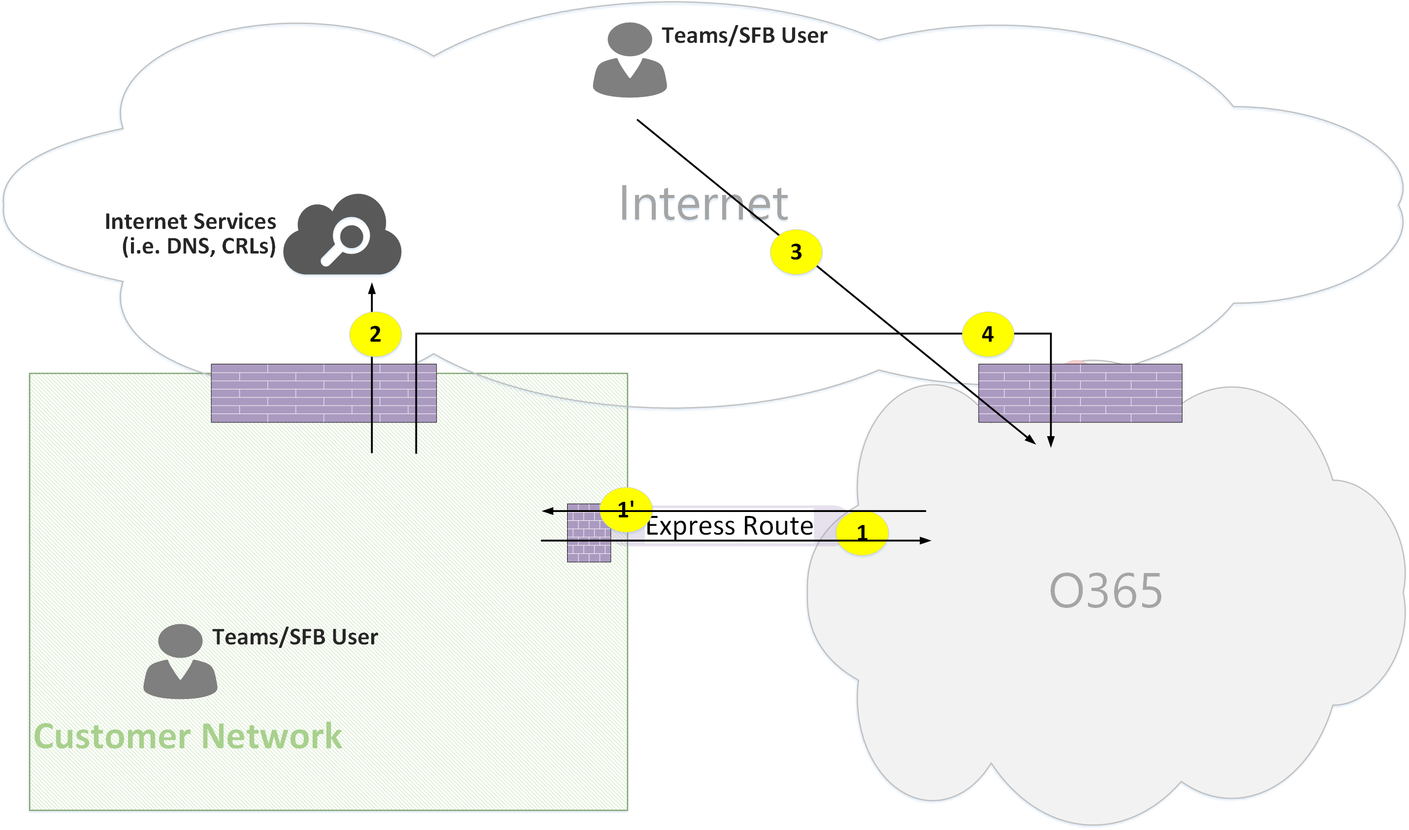 Für den Fall, dass ExpressRoute gerechtfertigt und bereitgestellt wird, können Teams-Flows von Flow 4 zu Flow 1 und von Flow 4' zu Flow 1' umgeleitet werden. Die Teams-Anwendung hat jedoch eine feste Abhängigkeit von anderen Microsoft 365-Datenflüssen über das Internet mithilfe von Flows 4 und 4'; daher dürfen diese Datenflüsse nicht blockiert werden.