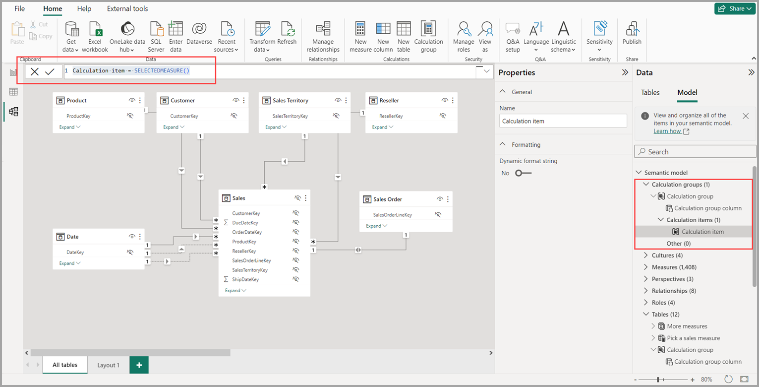 Nachdem Sie Ja ausgewählt haben oder wenn Sie die Eigenschaft „Implizite Measures verhindern” bereits aktiviert haben, wird eine Berechnungsgruppe hinzugefügt, und Sie können mit der Definition des DAX-Ausdrucks des ersten Berechnungselements in der DAX-Bearbeitungsleiste beginnen.