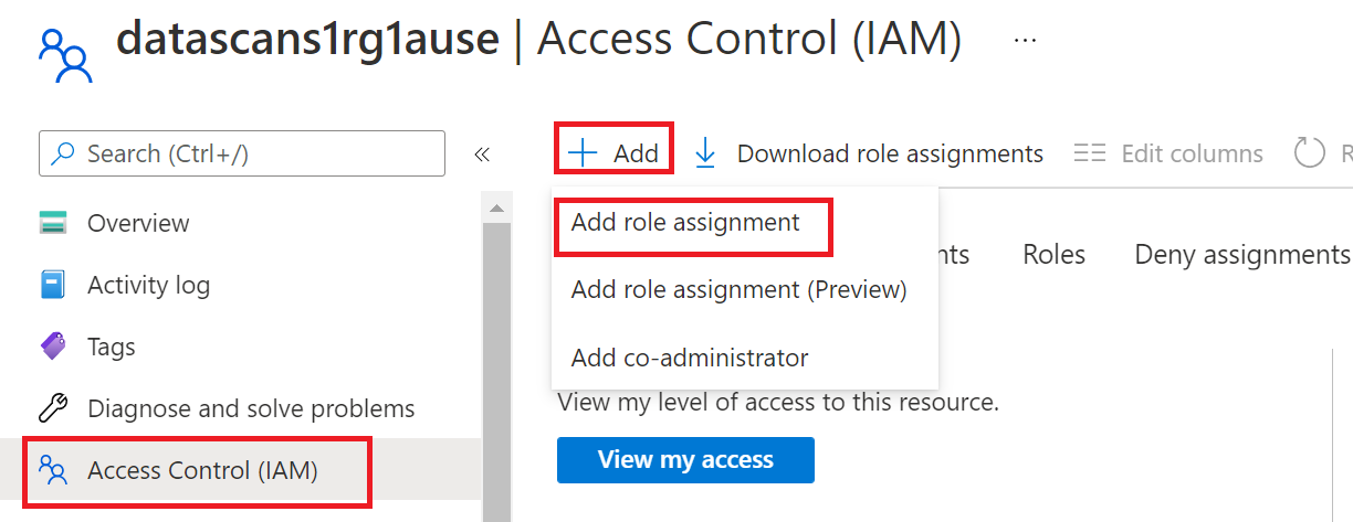 Befolgen Sie diese Anleitung, um Berechtigungen für die rollenbasierte Zugriffssteuerung (Role-Based Access Control, RBAC) in Azure zu konfigurieren. Der folgende Screenshot zeigt, wie Sie auf den Abschnitt Access Control in der Azure-Portal zugreifen, damit die Datenressource eine Rollenzuweisung hinzufügen kann.