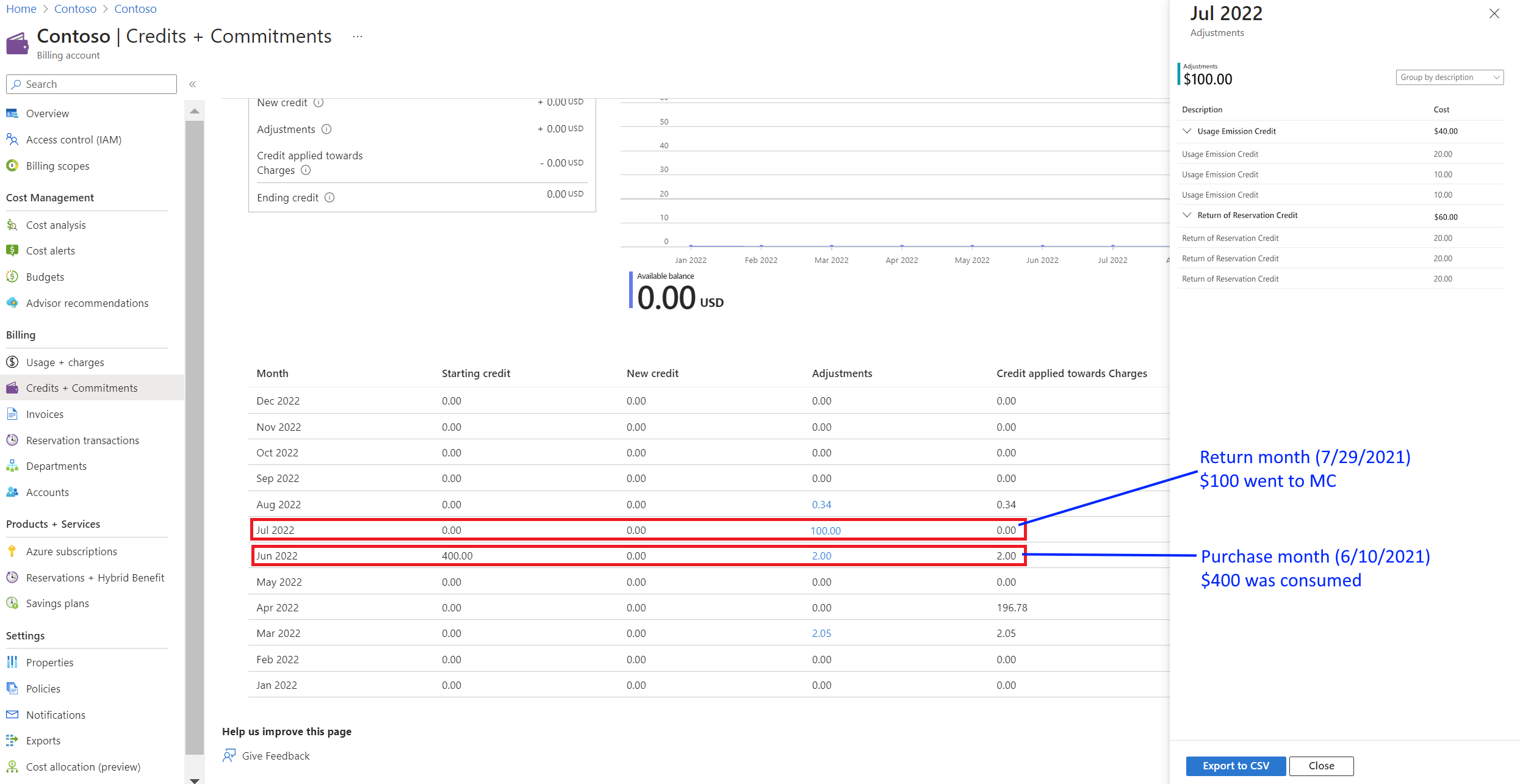 - After the reservation return completed for July 2022, you get entitled to $100 credit. You receive the credit note for the refund amount. You can view it on the Invoices page. The same credit appears under Refunded overage credits on the Usage & Charges page. The $100 of adjustments are shown on the Credits + Commitments page. There's no change for adjustments shown on the Credits + Commitments page.