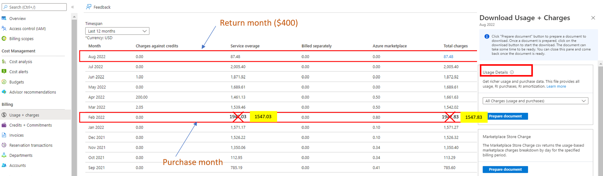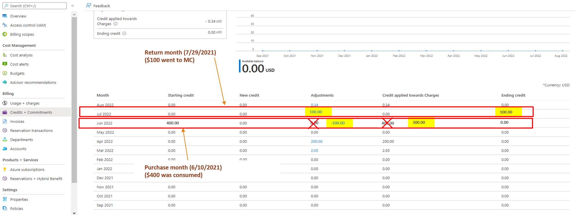 Refunds use the same payment methods used for the purchase. In July 2022, your monetary credit is adjusted with the relative credit amount. In August 2022, you also receive a credit for the overage portion of the refund. The credit amount and adjustment appears in the Azure portal for June 2022. The adjustment for the month of return (June 2022) results in a change as service overage. You can view the total charges on the Usage + charges page. You can see the Credit applied towards charges value shown on the Credits + Commitments page.