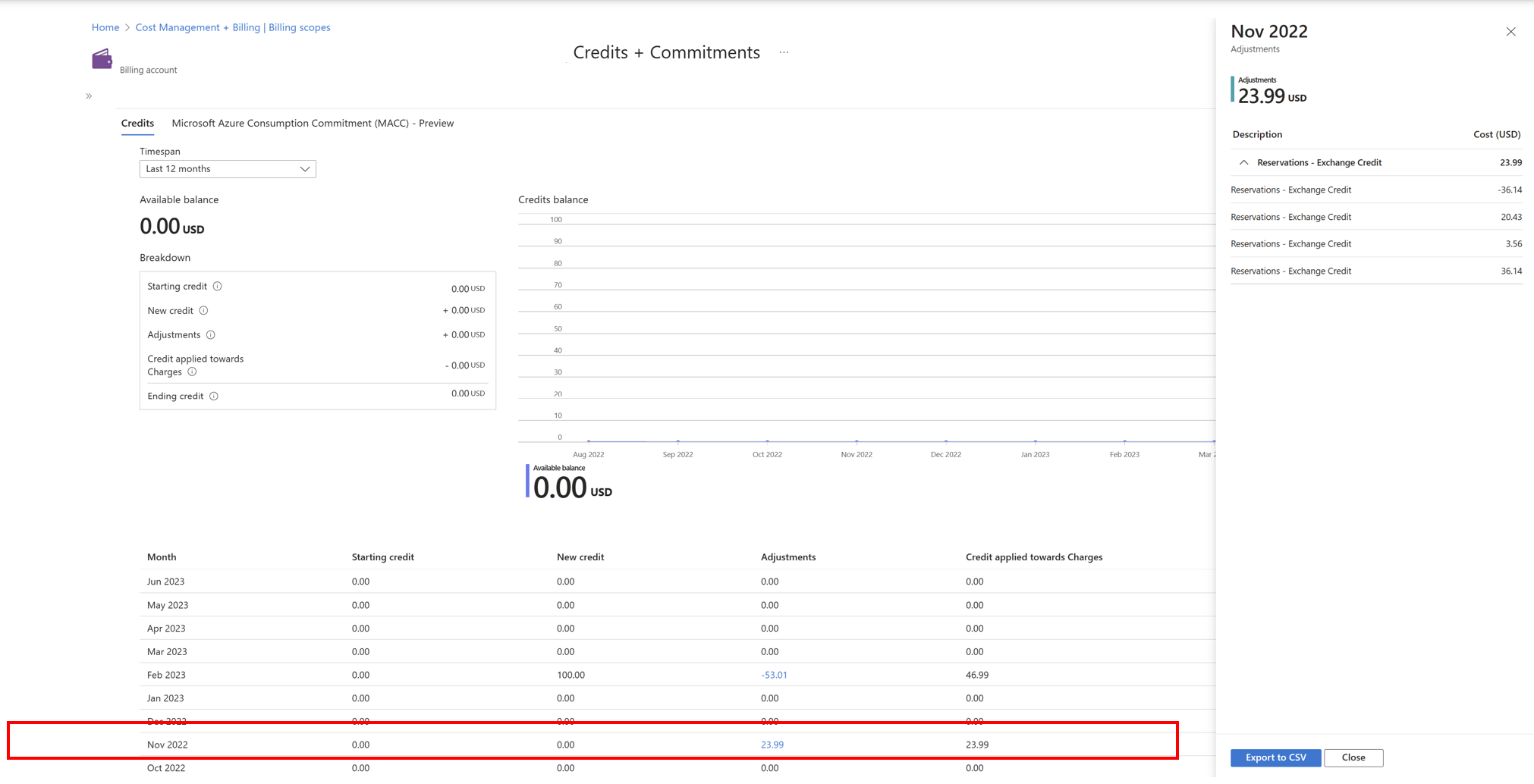 - Navigate to the Credits + Commitments page and look at the value shown in Adjustments. It shows all refunds applied to the MC balance for the month.