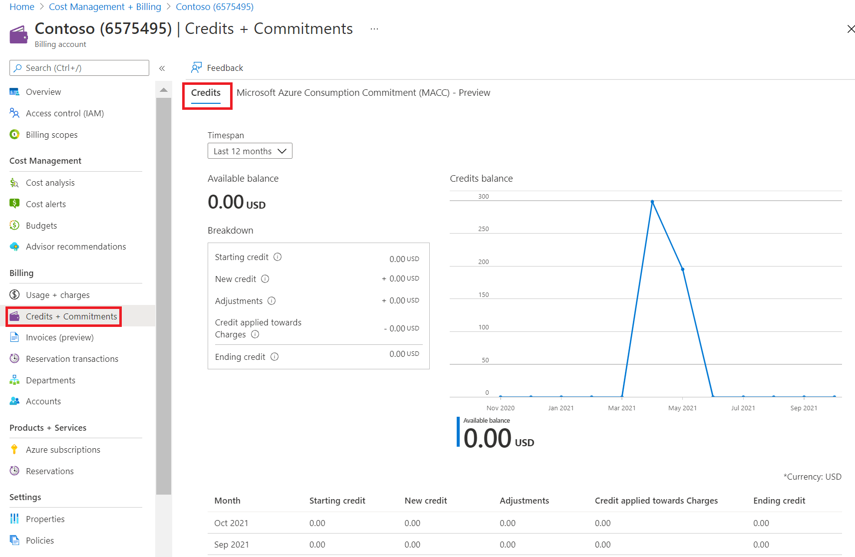 The information in this section describes how an EA administrator or partner administrator can view the starting balance, ending balance, and credit adjustments for your Azure Prepayment (previously called monetary commitment).
