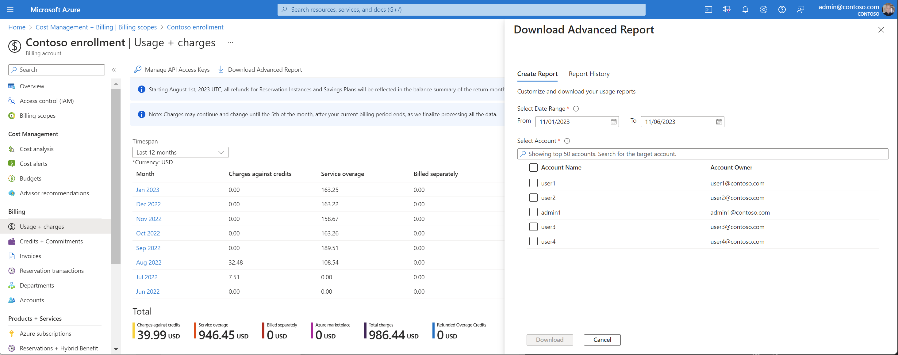 - Navigate to Usage + charges look at the value shown in Refunded Overage Credits. The value is sum of all reservation and savings plan refunds that happened in the month.