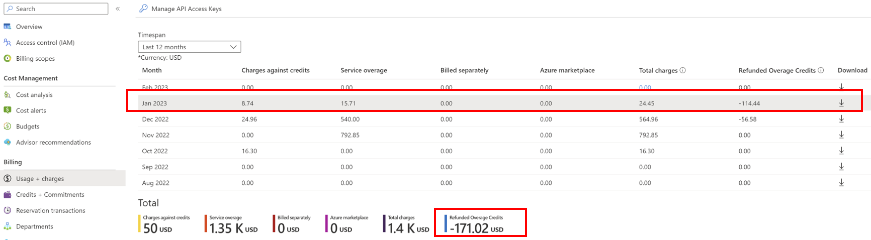 In the current refund process, totals in the purchase month overage, total charges, and Credits applied towards Charges don't change (for example, June 2022). Credits given for that month are shown under Refunded overage credits. Adjustments are shown for the refund month on the Credits + Commitments page.