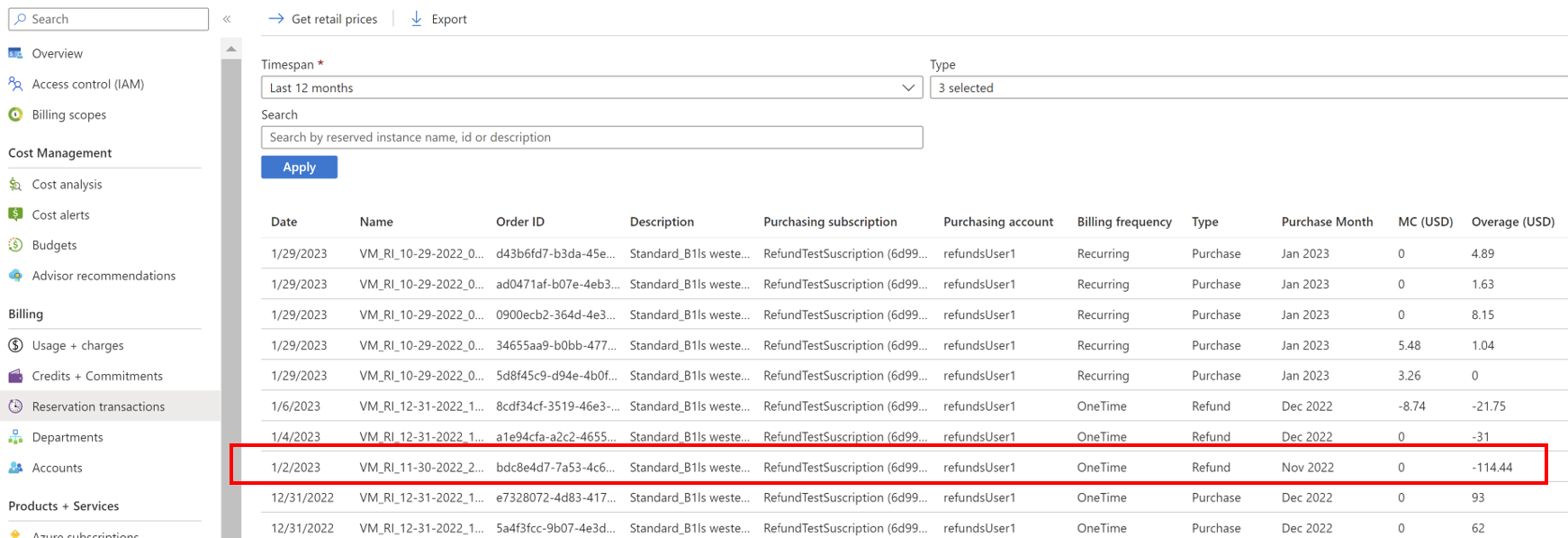 Here's how a refund example appeared in the Azure portal for the previous refund process. The following points explain the refund.