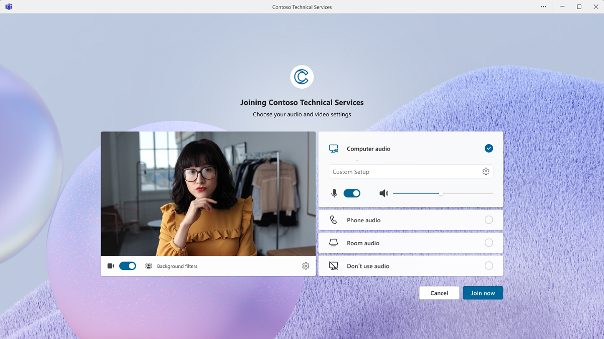 Professionalism: When used together, custom backgrounds and meeting themes create consistently polished and professional appearance for your meetings. You can upload various background images that include your org's logo or other branding assets. Users attending a specific meeting or meeting series can agree to use one specific background to show unity and professionalism to attendees outside of the organization. With meeting themes, the custom pre-join or lobby that reflects your brand’s identity greets attendees as they join a meeting.