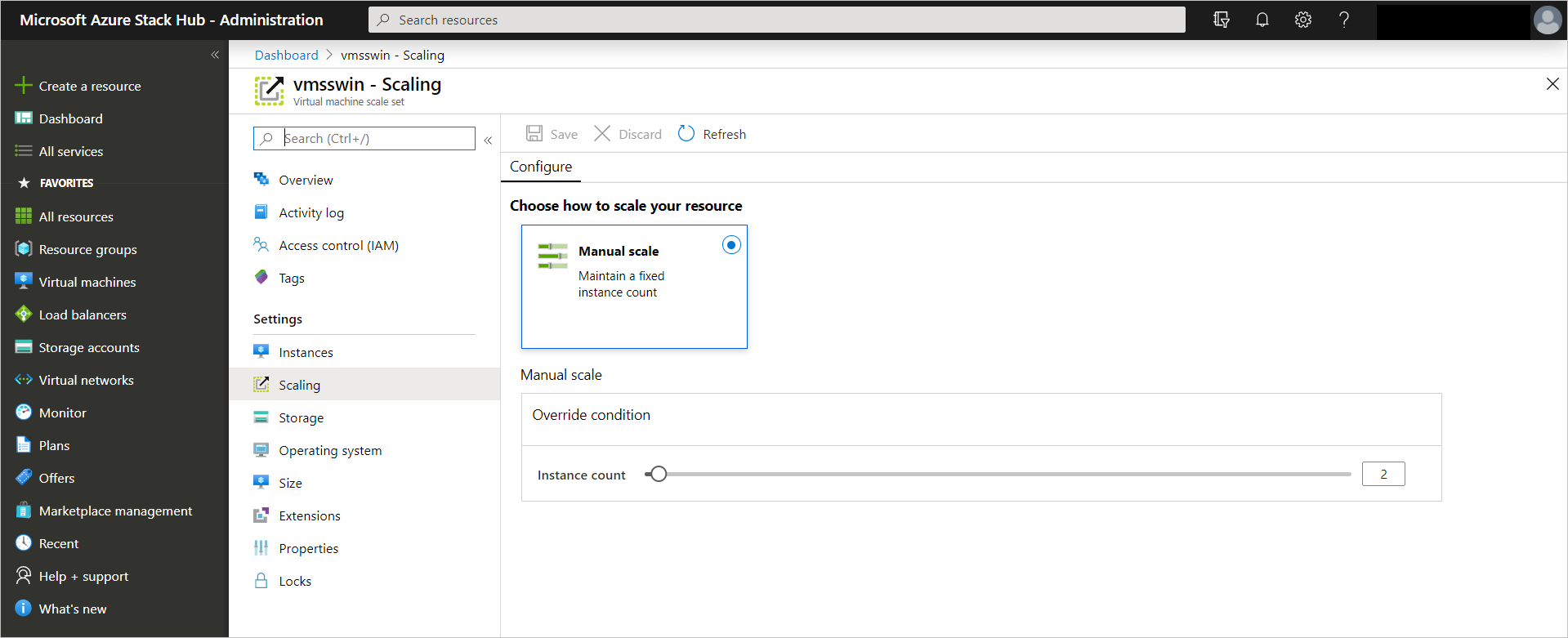 On Azure Stack Hub, virtual machine scale sets do not support autoscale. You can add more instances to a scale set using Resource Manager templates, Azure CLI, or PowerShell.
