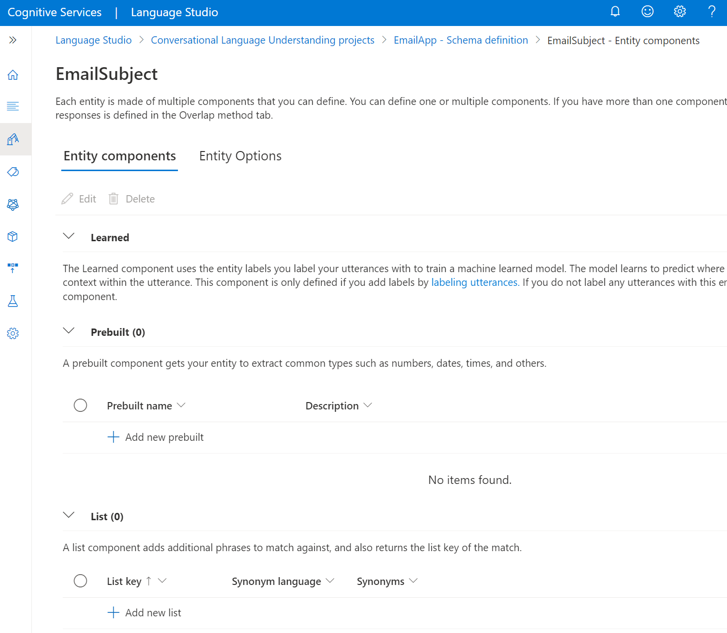 After you create an entity, you can select the entity name to change the Entity components type. Multiple components like learned, list, regex, or prebuilt are used to define every entity. A learned component is added to all your entities after you label them in your utterances.