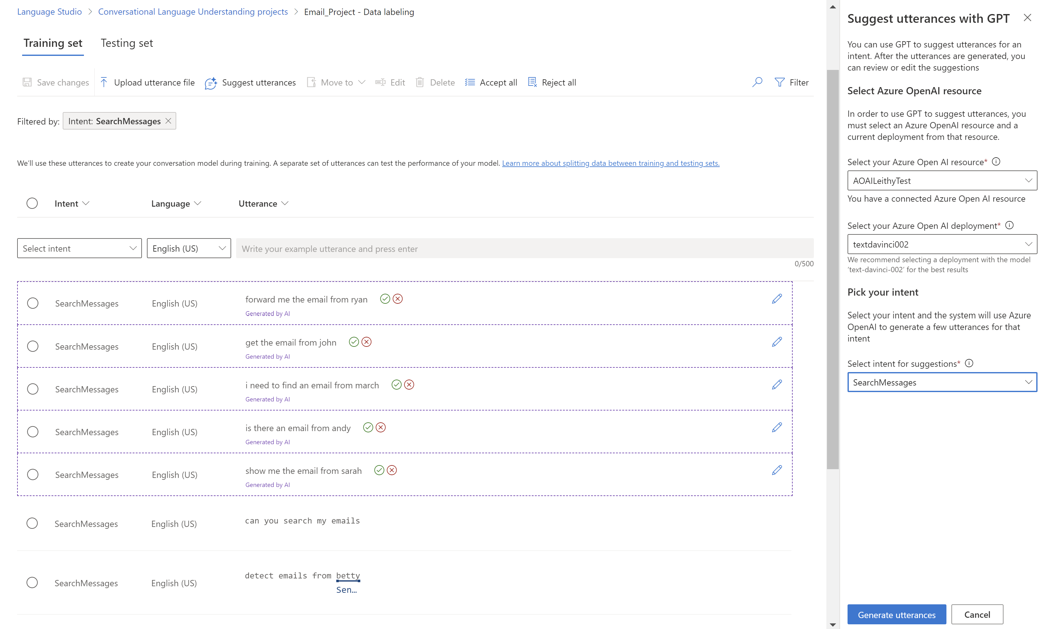 To add to the training set, in Language Studio, on the Data labeling tab, select Suggest utterances. Conversational Language Understanding sends a call to Azure OpenAI to generate similar utterances.