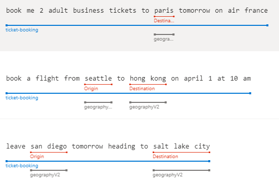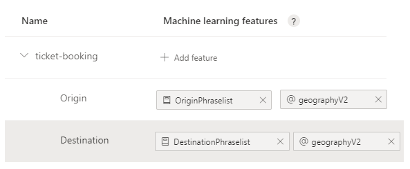 The ticket-booking entity is a machine-learning entity, with subentities including Origin and Destination. These subentities both indicate a geographical ___location. To help extract the locations, and distinguish between Origin and Destination, each subentity should have features.