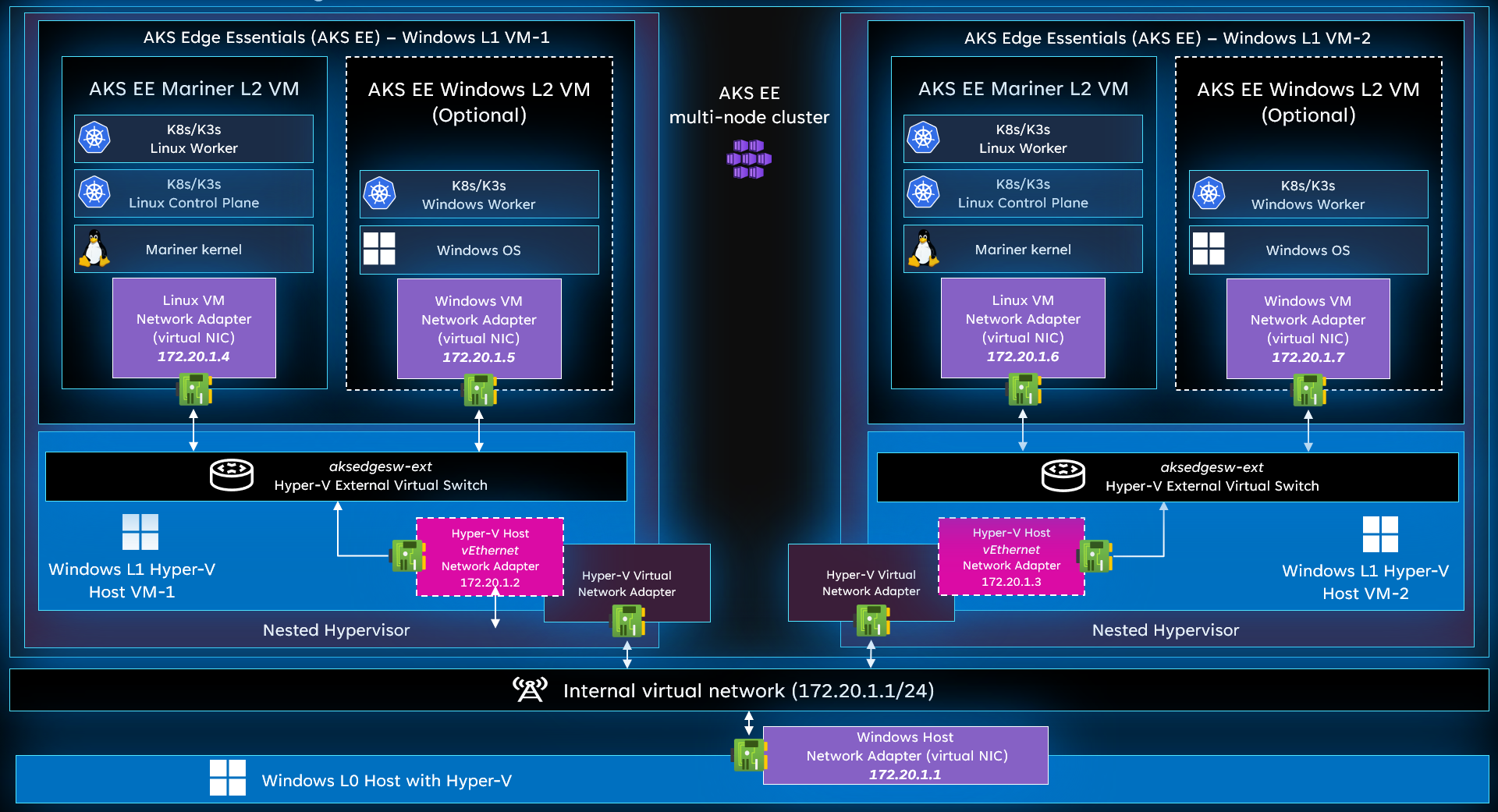 - L2 Virtual Machine: AKS Edge Essentials nested VM (Linux or Windows) running on top of the L1 Windows virtual machine.