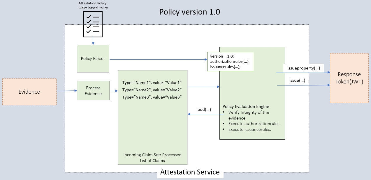 - The uploaded attestation policy is used to evaluate the evidence over the rules authored in the attestation policy.