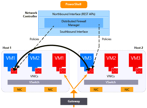 You enable and configure Datacenter Firewall by creating network security groups (NSGs) that get applied to a subnet or a network interface. Firewall policies are enforced at the vSwitch port of each tenant virtual machine (VM). The policies are pushed through the tenant portal, and Network Controller distributes them to all applicable hosts.