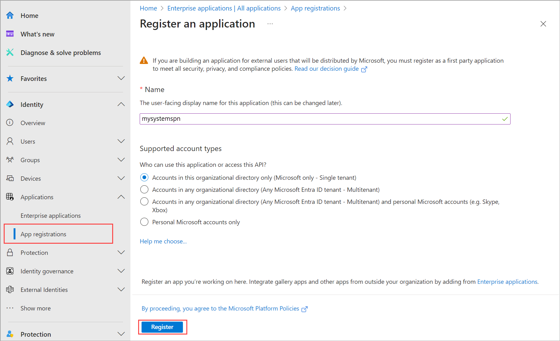 Sign in to the Microsoft Entra admin center as at least a Cloud Application Administrator. Browse to Identity > Applications > App registrations then select New registration.