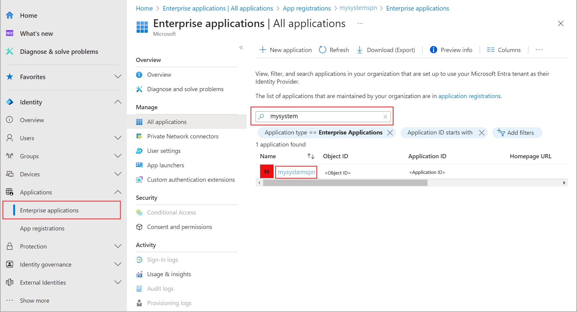 Once the service principal is created, go to the Enterprise applications page. Search for and select the SPN you created.