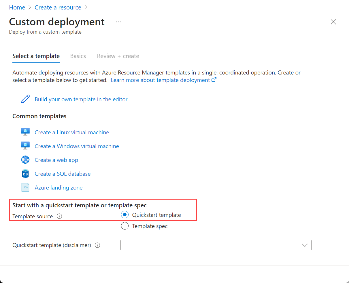 Near the bottom of the page, find Start with a quickstart template or template spec section. Select Quickstart template option.