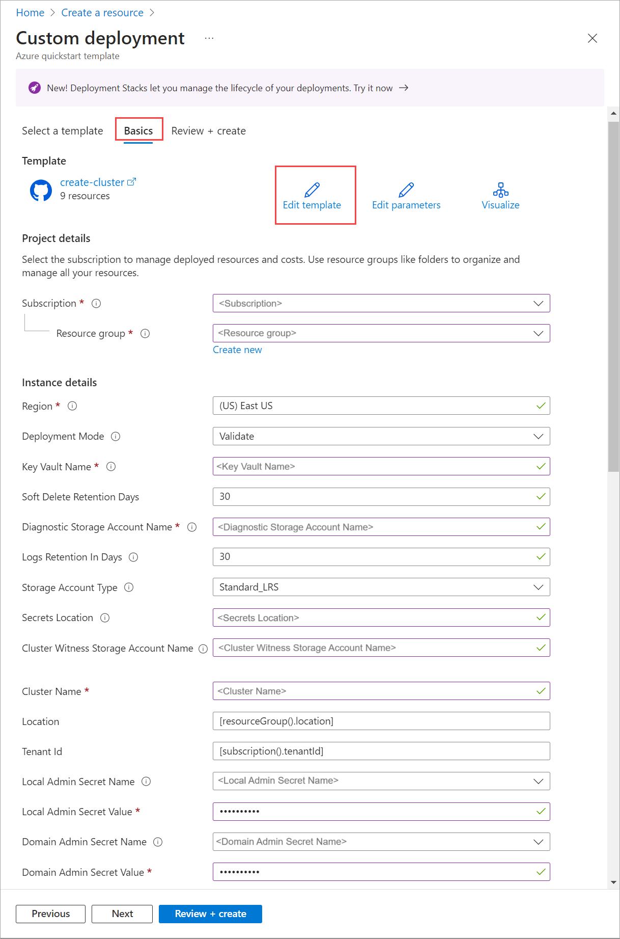 On the Custom deployment screen, select Edit parameters. Load up the previously saved parameters and select Save.