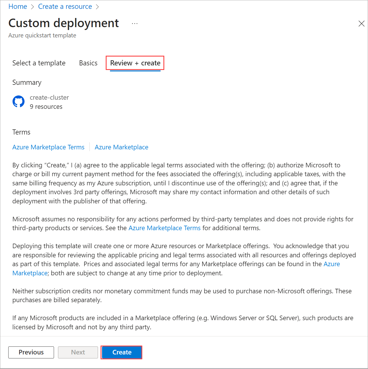 Select Create. The deployment begins, using the existing prerequisite resources that were created during the Validate step.
