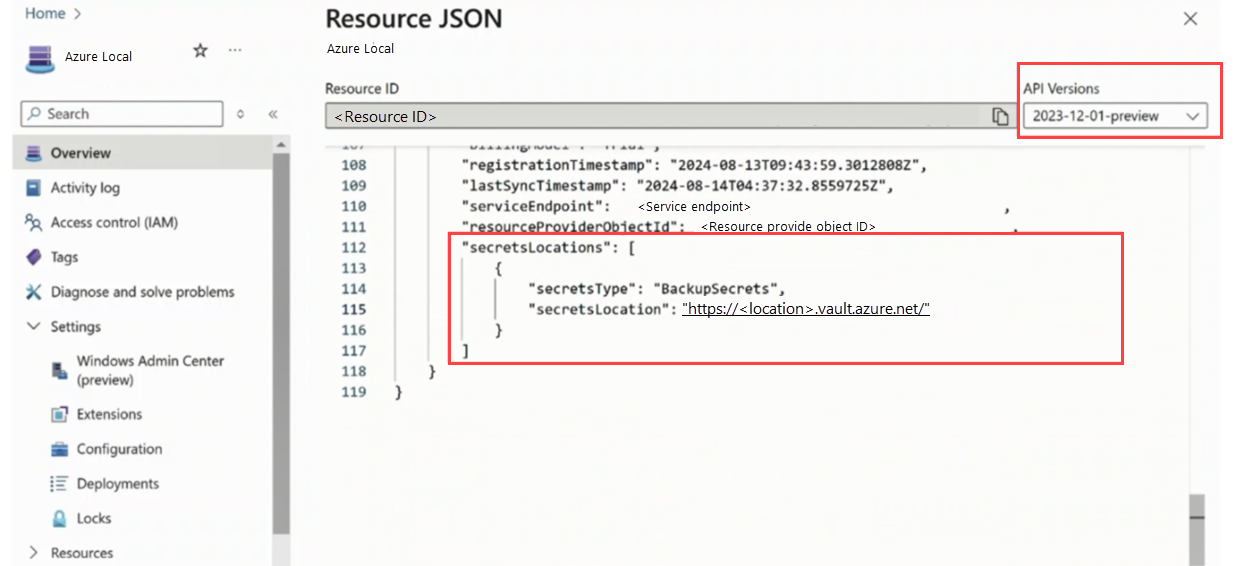 Validate configuration. In the Azure portal, open the system resource, and verify that Resource JSON includes the updated Key Vault details.