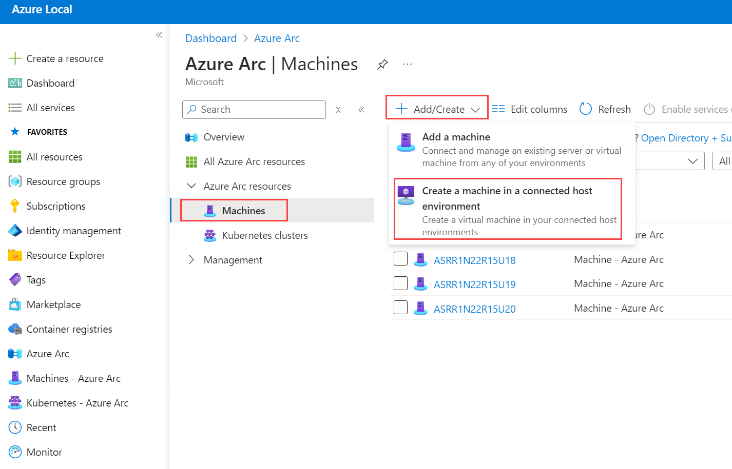 Create a VM in the portal by selecting Azure Arc > Machines > Add/Create > Create a machine in a connected host environment. For more information, see step 7 under the Create Azure Local VMs section.