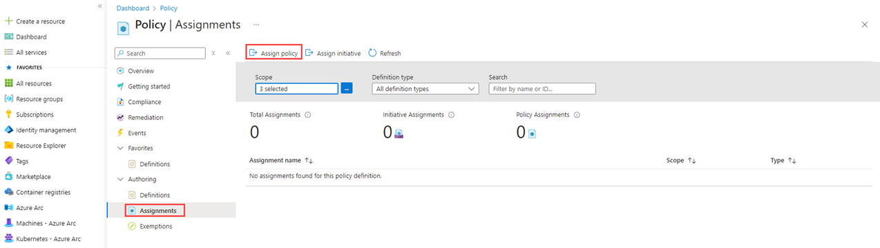 Under the Authoring section, choose Assignments, and then select + Assign policy.