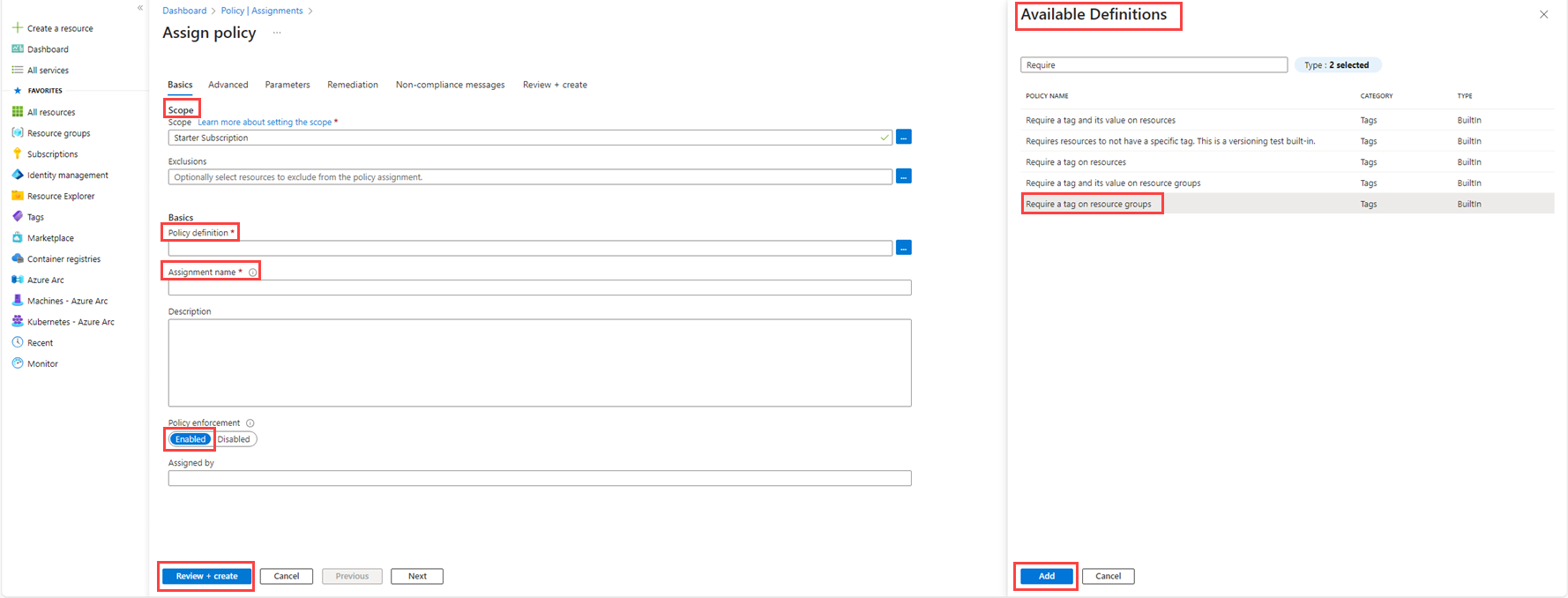 You can use Azure Policy to enforce tags on various resources. In this example, we've used a built-in policy that enforces tags on resource groups. This prevents the creation of resource groups without the required tag. To enable an Azure Policy, follow these steps: