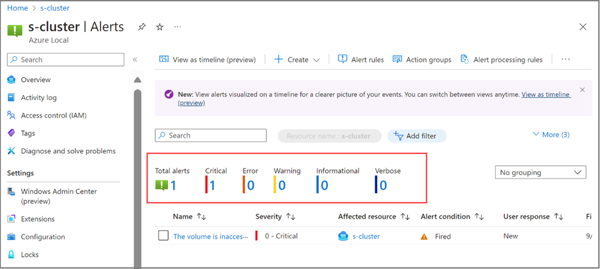 In the Azure portal, you can review health alerts on your Azure Local system in real-time from the Monitoring > Alerts blade.