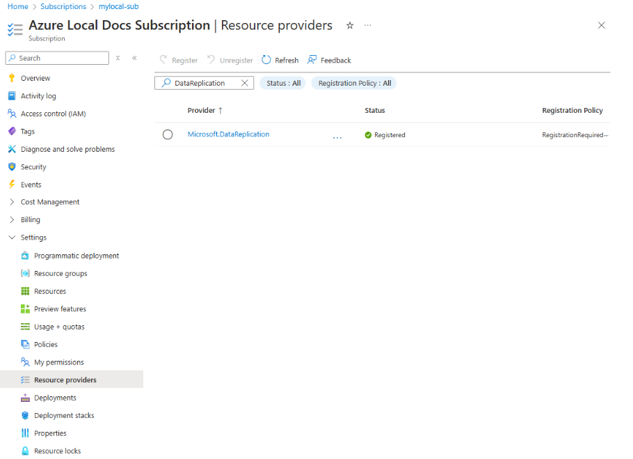 For any subscriptions hosting resources used in migration, such as Azure Migrate project subscriptions and target Azure Local instance subscriptions, the Microsoft.DataReplication resource provider must be registered. For more information, see register resource provider.