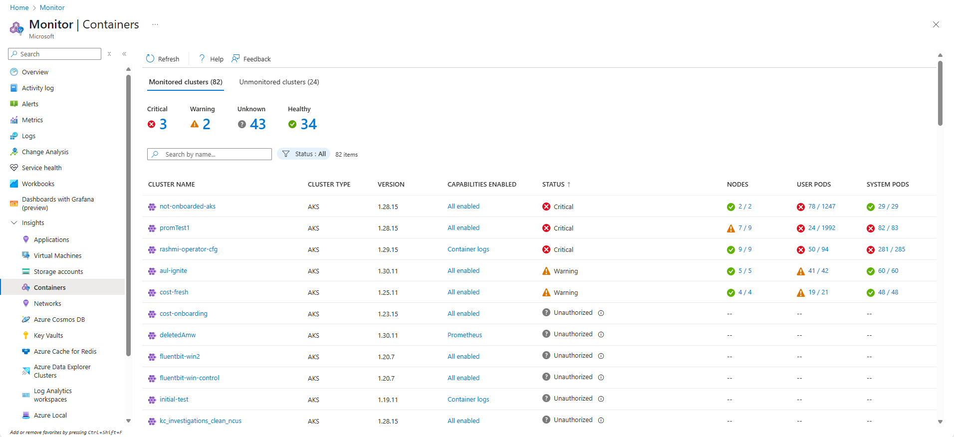 To open the multi-cluster view, select Containers from the Insights section of the Monitor menu in the Azure portal. This view shows the health status of all monitored Kubernetes clusters deployed across resource groups in your subscriptions. This view allows you to quickly identify clusters that are in a critical or unhealthy state and also helps you to enable and configure monitoring for all clusters in your environment. See Enable monitoring for AKS clusters for details.