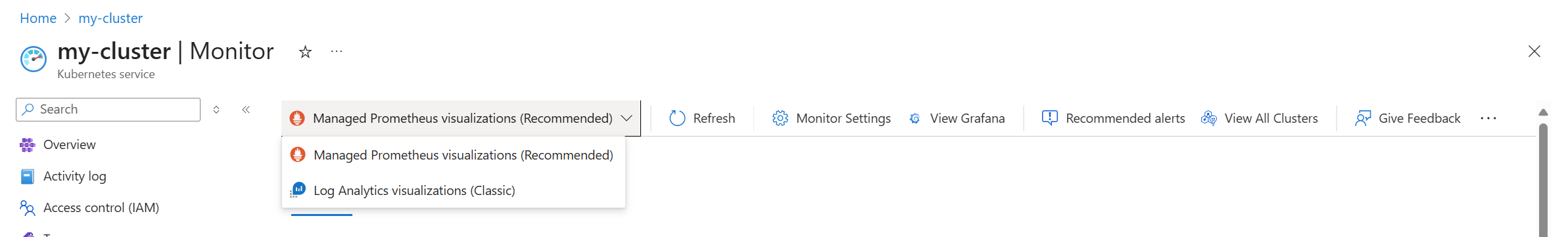 Visualization | Allows you to select which data source is used to populate the view. Managed Prometheus visualizations is the preferred setting which uses Prometheus metrics stored in an Azure Monitor workspace. These are enabled when you enable Managed Prometheus for the cluster. Log Analytics visualizations uses performance data stored in a Log Analytics workspace. You may not be collecting this data if you aren't collect performance data in your logging profile. This option won't be available if Managed Prometheus isn't enabled for the cluster. |