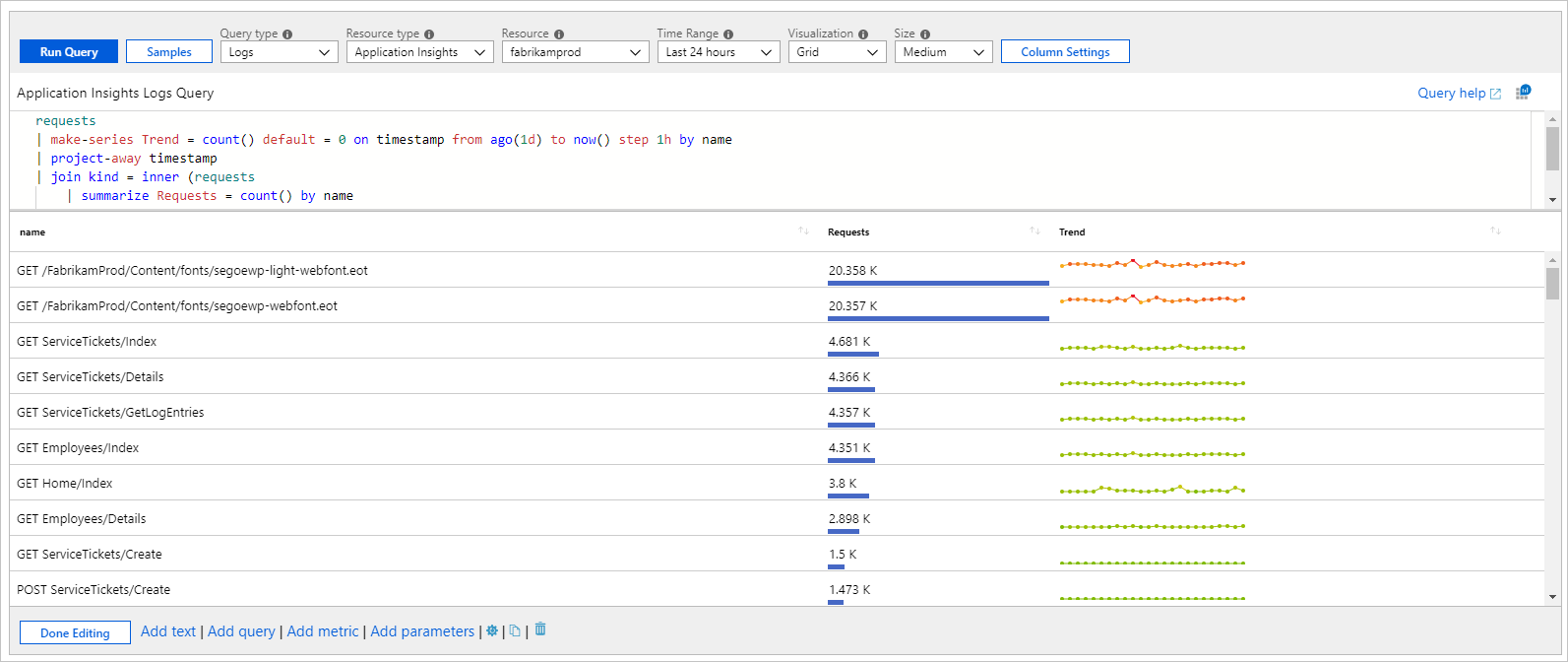 | Query | Any KQL query that returns data in the format expected by the chart visualization. | requests | summarize Requests = count() by name |
