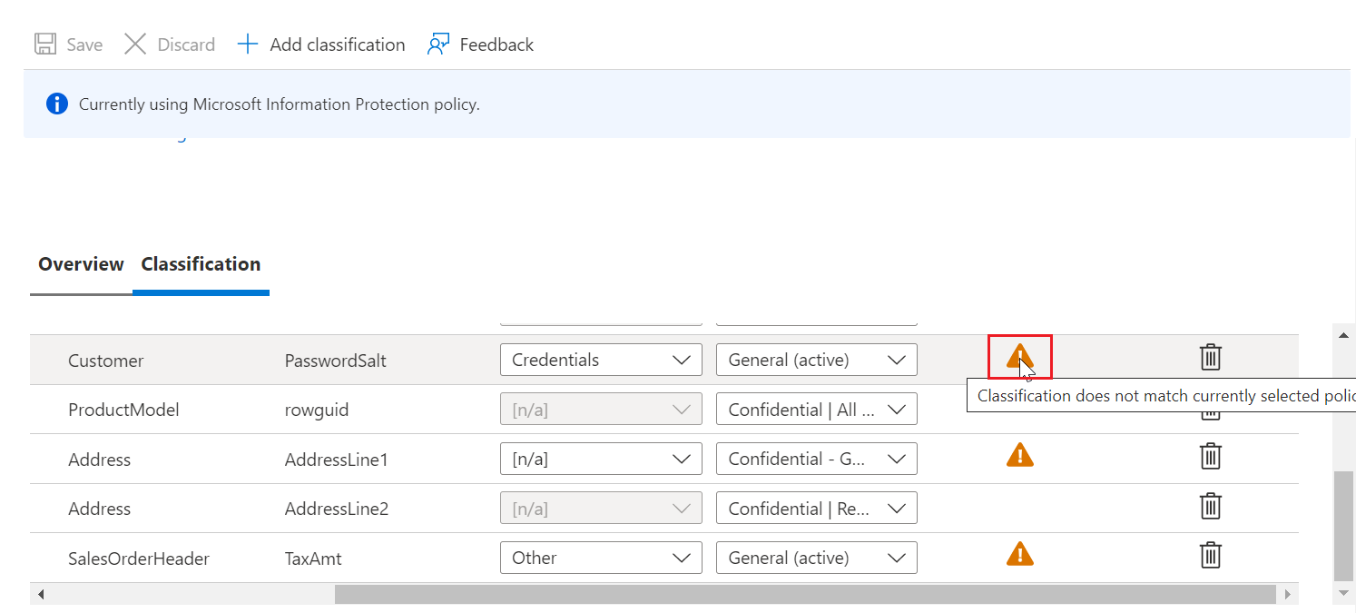 [n/a]while you are in MIP policy mode and automatic data discovery & recommendations remain disabled.A warning icon may appear against an already classified column if the column was classified using a different Information Protection policy than the currently active policy. For example, if the column was classified with a label using SQL Information Protection policy earlier and now you are in Microsoft Information Protection policy mode. you'll see a warning icon against that specific column. This warning icon doesn't indicate any problem, but is used only for information purposes.