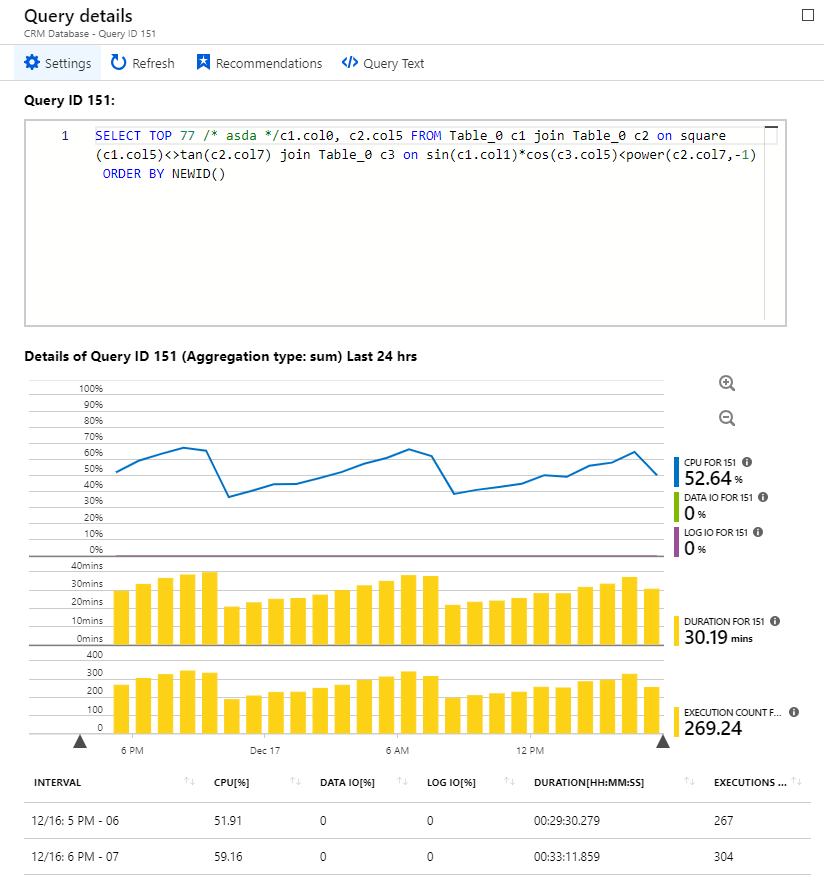 - The top chart shows a line with the overall database DTU percentage. The bars are the CPU percentage that the selected query consumed.