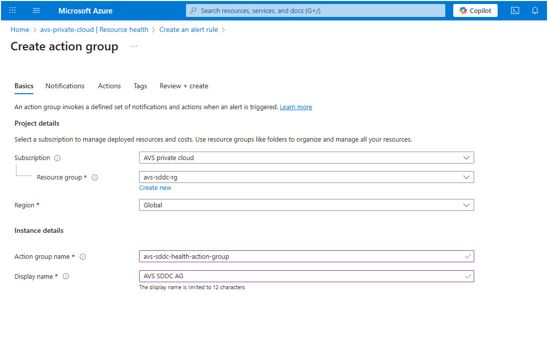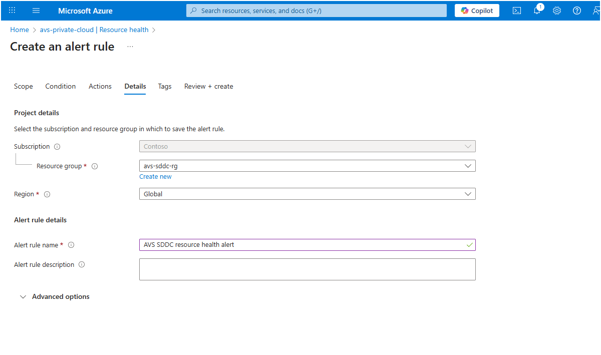 For Region, choose Global. Resource Health alerts can only be located in the Global region (which is the default).