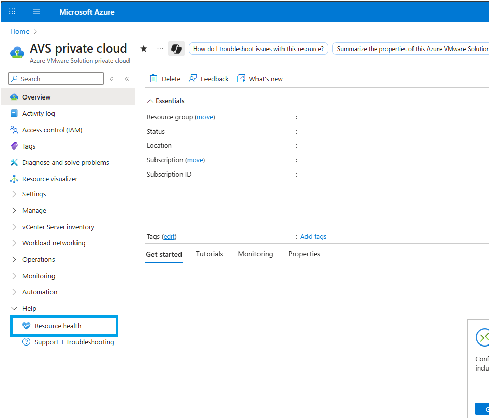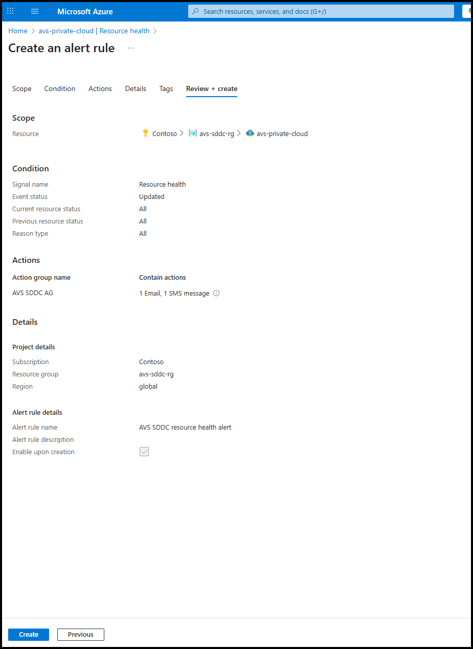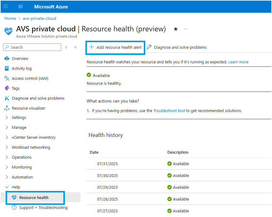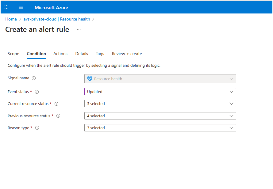 This article shows you how to create or edit a resource health alert rule in Azure Monitor for your Azure VMware Solution private cloud. To learn more about alerts, see the alerts overview.
